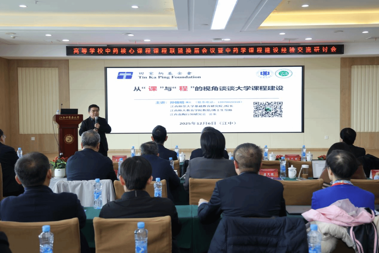 开幕式后,多位专家学者作专题报告。江西中医药大学刘红宁教授以“人工智能时代教育变革”为题进行分享;江西师范大学基础教育研究院院长孙锦明教授从“课”与“程”的维度探讨大学课程建设;辽宁中医药大学原副校长康廷国教授交流了《中药鉴定学》教材编写心得;课程联盟理事长、北京中医药大学张冰教授围绕“《中药学》课程建设要素与实践路径”展开论述;成都中医药大学彭成教授就“新时代中药学高层次人才培养与教材建设”发表见解;江西中医药大学副校长钟凌云教授介绍了中药炮制学课程联盟的建设探索。报告内容扎实、视角多元,现场学术氛围浓厚。