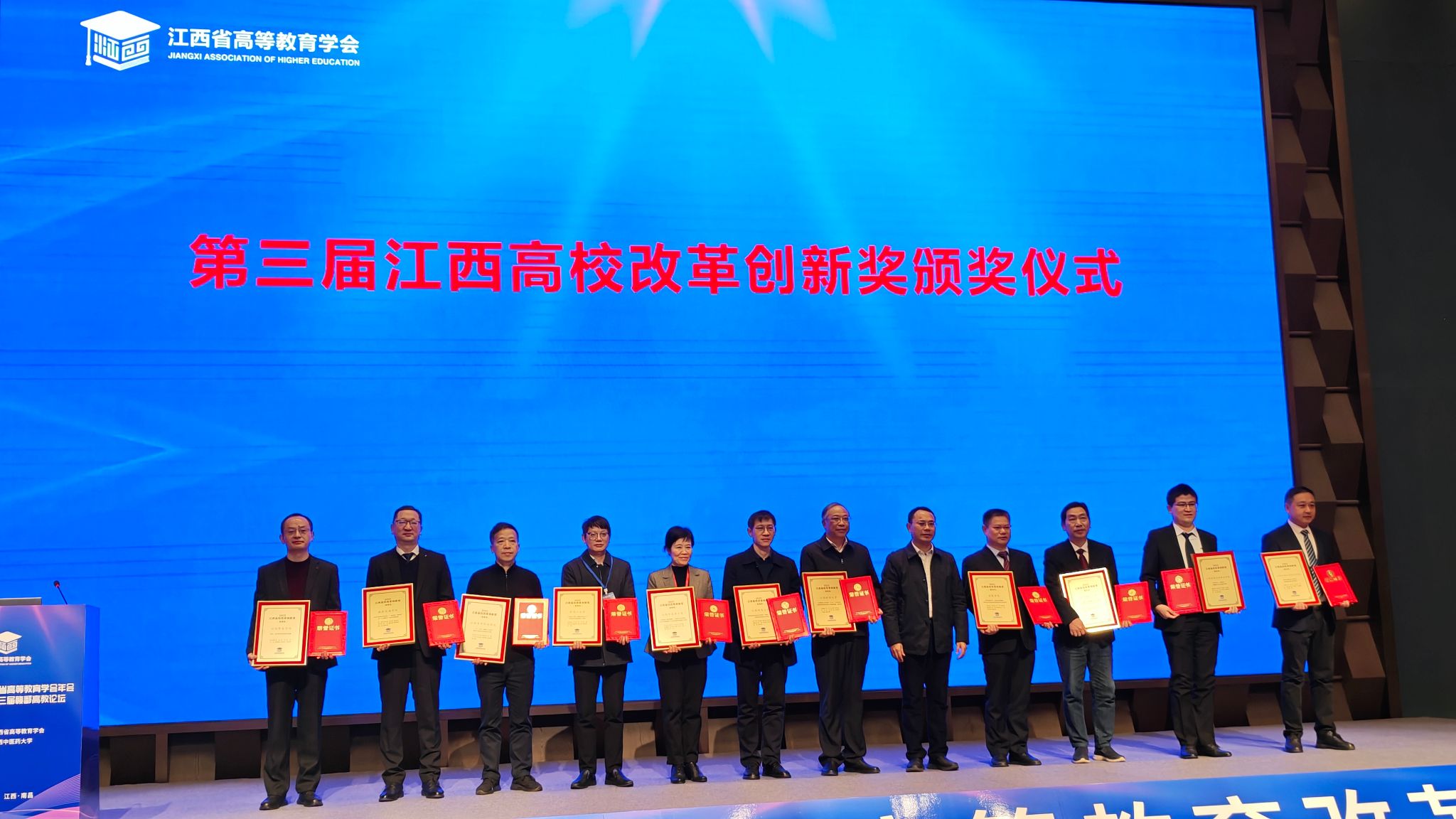 江中新闻网讯(通讯员 胡凌云 )12月27日,2025年江西高校改革创新奖颁奖仪式在南昌举行。我校《志同道合 愿景激励——聚焦中药学优势学科长周期领军人才培育的改革创新与实践》项目荣获2025年江西高校改革创新奖(管理类),受到表彰,党委副书记、校长朱卫丰代表学校领奖。