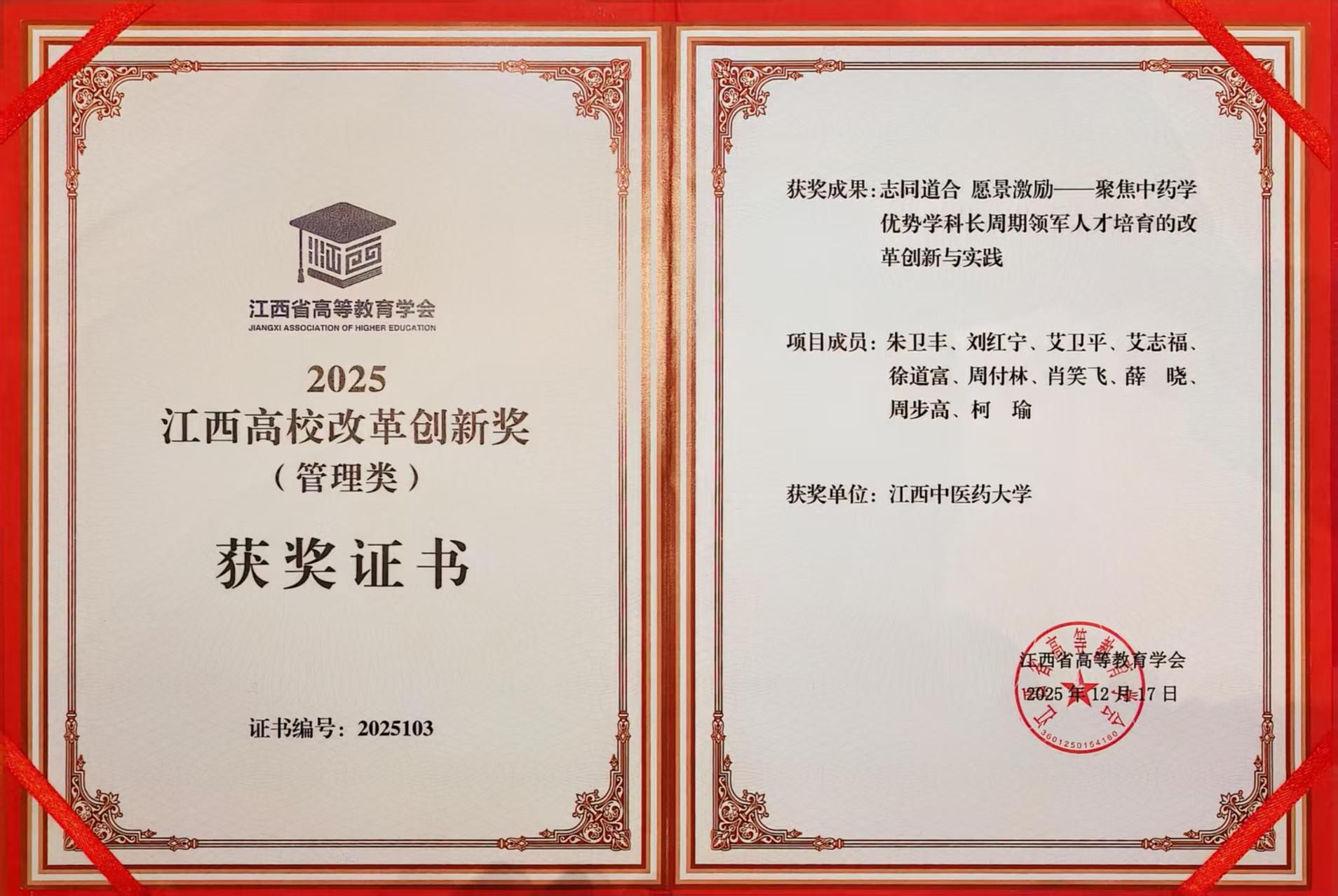 据悉,江西高校改革创新奖由江西省高等教育学会组织评选,旨在深入学习贯彻习近平总书记关于教育的重要论述和考察江西重要讲话精神,管理类主要表彰高校在办学治校、管理改革、统筹推进教育科技人才一体化发展、有组织科研等方面进行的改革创新,并取得显著成效和突出成果。此次我校项目成功获奖,是对学校在中药学优势学科人才培育领域改革创新实践的高度认可。