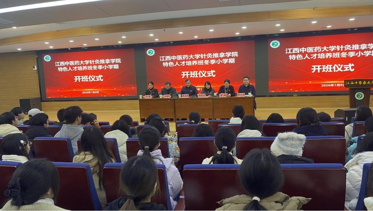 江中新闻网讯(通讯员 曹颖 太宇星 赵怡坤)1月9日,针灸推拿学院2025-2026学年灵枢大医班、热敏灸产业学院、针灸康复一体化技能培训早临床实践班等特色人才班冬季小学期开班仪式在图书馆学术报告厅隆重举行。学校党委委员、副校长周志刚教授,党委委员、副校长钟凌云教授出席开班仪式。针灸推拿学院领导班子、针灸推拿学院教师以及各特色人才班全体学员共同参与。