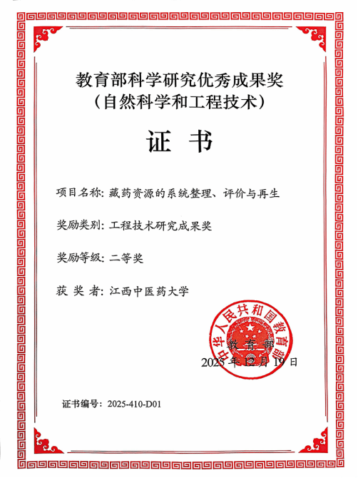 江中新闻网讯(通讯员 饶金龙 潘玲玲)近日,教育部公布了2025年度教育部科学研究优秀成果奖(自然科学和工程技术)名单,我校首席教授钟国跃主持的“藏药资源的系统整理、评价与再生”项目荣获2025年度教育部科学研究优秀成果奖(自然科学和工程技术)工程技术研究成果奖二等奖。此次获奖是我校自2019年以来连续第四次获批该奖项,系全省唯一实现连续四次获批此类奖项高校,近五年学校以第一完成单位牵头获得的该奖项总数稳居全省高校首位。