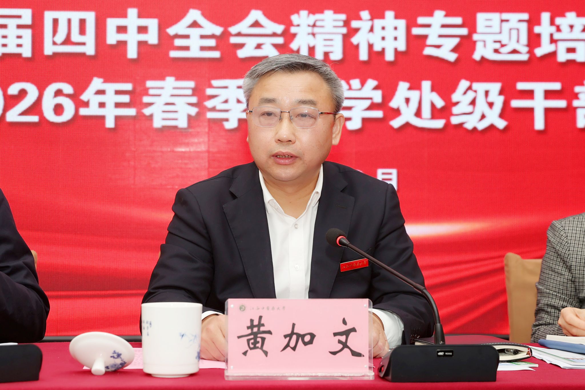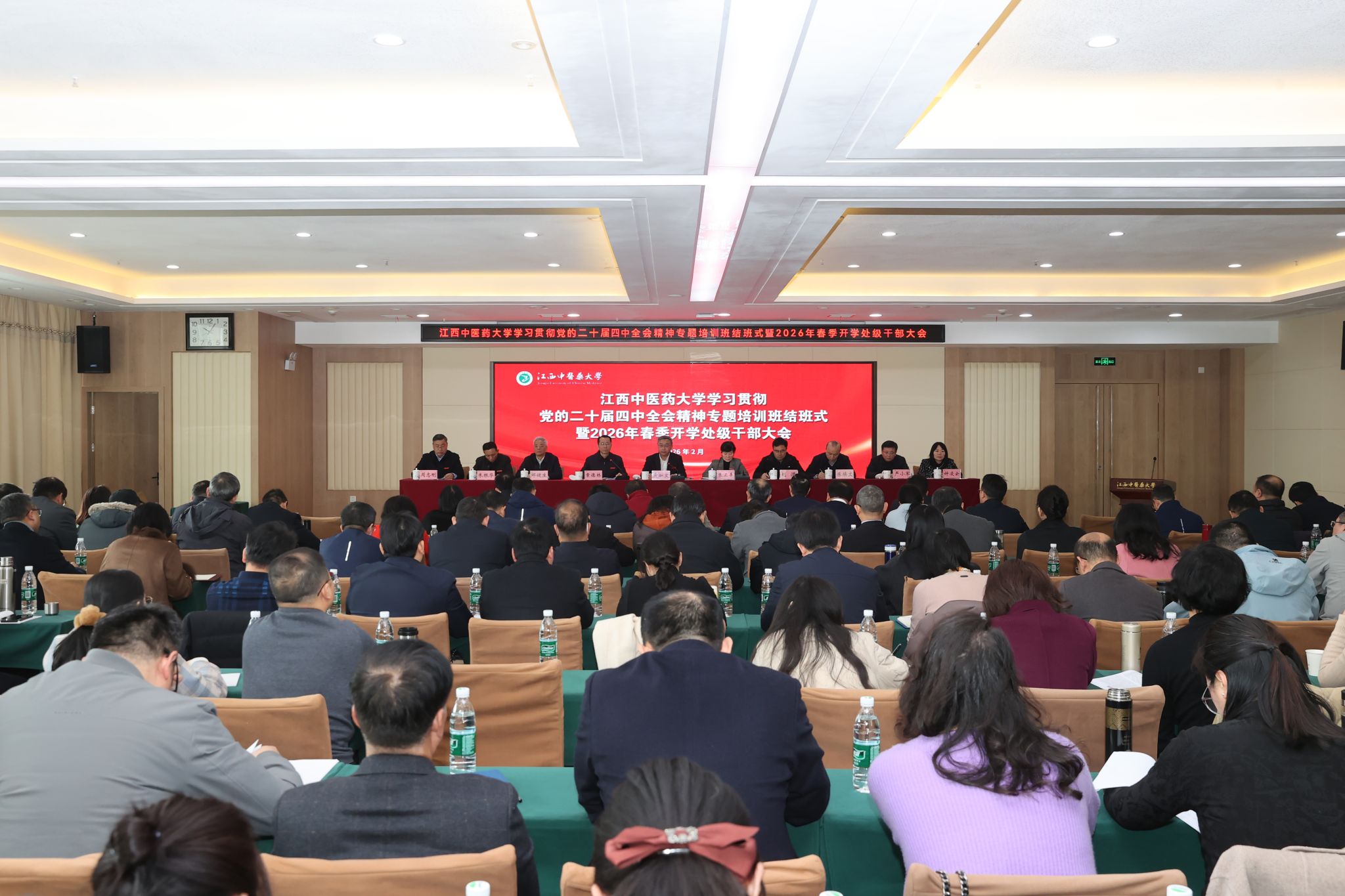 江中新闻网讯(记者 余浩)2月28日,学校召开学习贯彻党的二十届四中全会精神专题培训班结班式暨2026年春季开学处级干部大会,党委书记黄加文讲话,校长朱卫丰通报学校2025年发展情况及2026年党政工作要点,党委副书记章德林主持会议。校领导刘潜、邹健生、陈焕文、朱根华、严小军、周志刚、钟凌云,党委委员聂国林、薛铁瑛、徐道富、周小青出席,学校全体副处级以上干部参加。