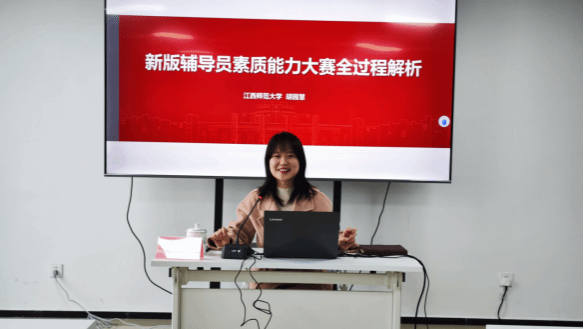 本次培训邀请了第八届全国高校辅导员素质能力大赛一等奖、第八届江西省高校辅导员素质能力大赛一等奖、江西省“十大最美辅导员”获得者,江西师范大学美术学院团委书记胡园慧教授为大家授课。胡园慧以《新版辅导员素质能力大赛全过程解析》为主题,结合自身多年参赛备赛经验和大赛评审视角,从大赛赛制变化、各环节考核重点、备赛技巧方法、典型案例解析等方面进行了系统全面的讲解。授课内容兼具理论高度与实践温度,既有对大赛规则的精准解读,又有对实操技巧的细致指导,更有对辅导员日常工作的经验分享,干货满满、指导性极强,为全体辅导员理清了备赛思路、明确了学习方向。