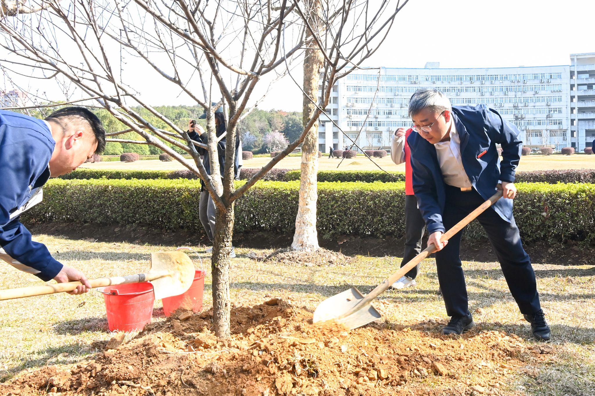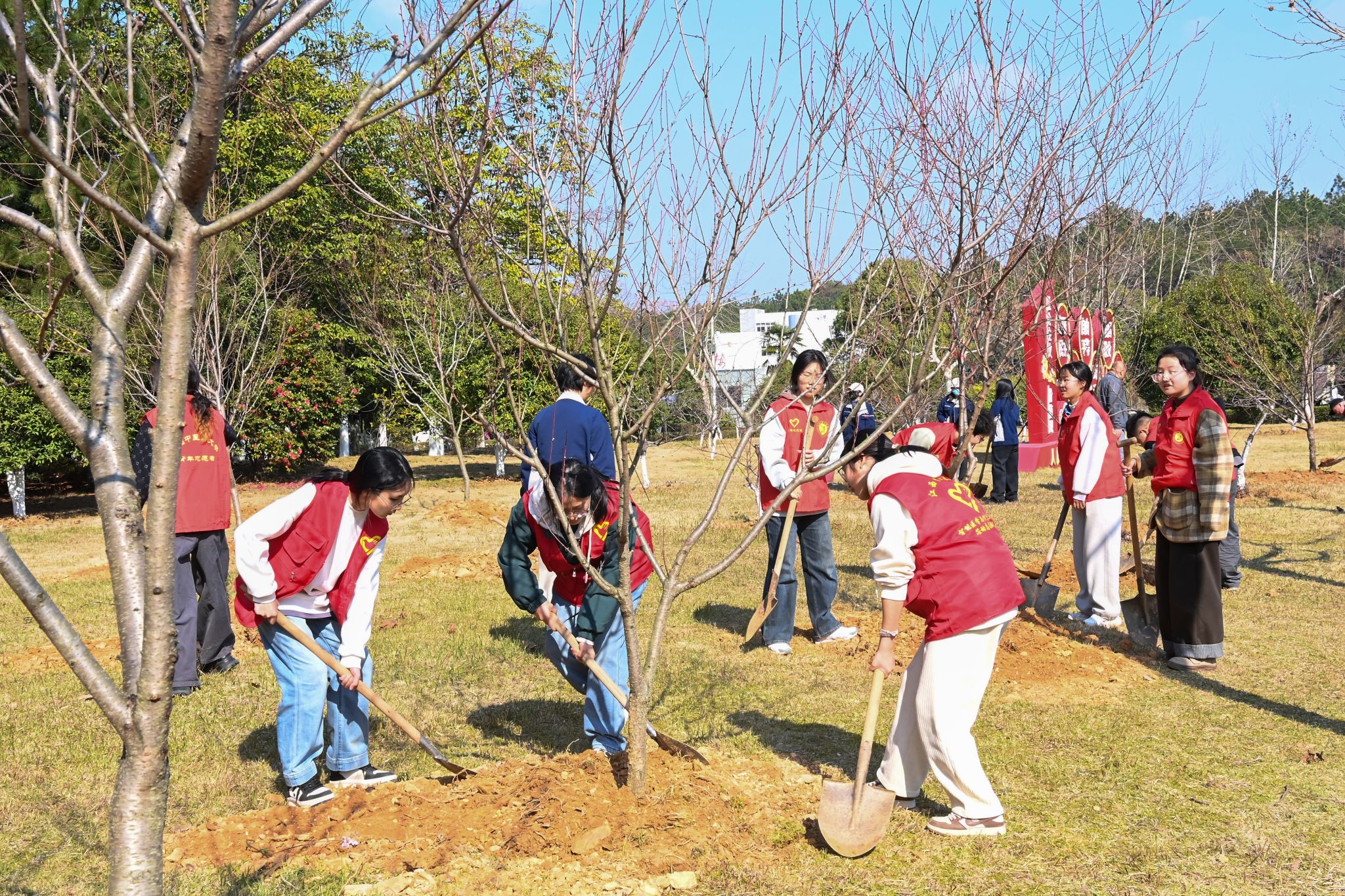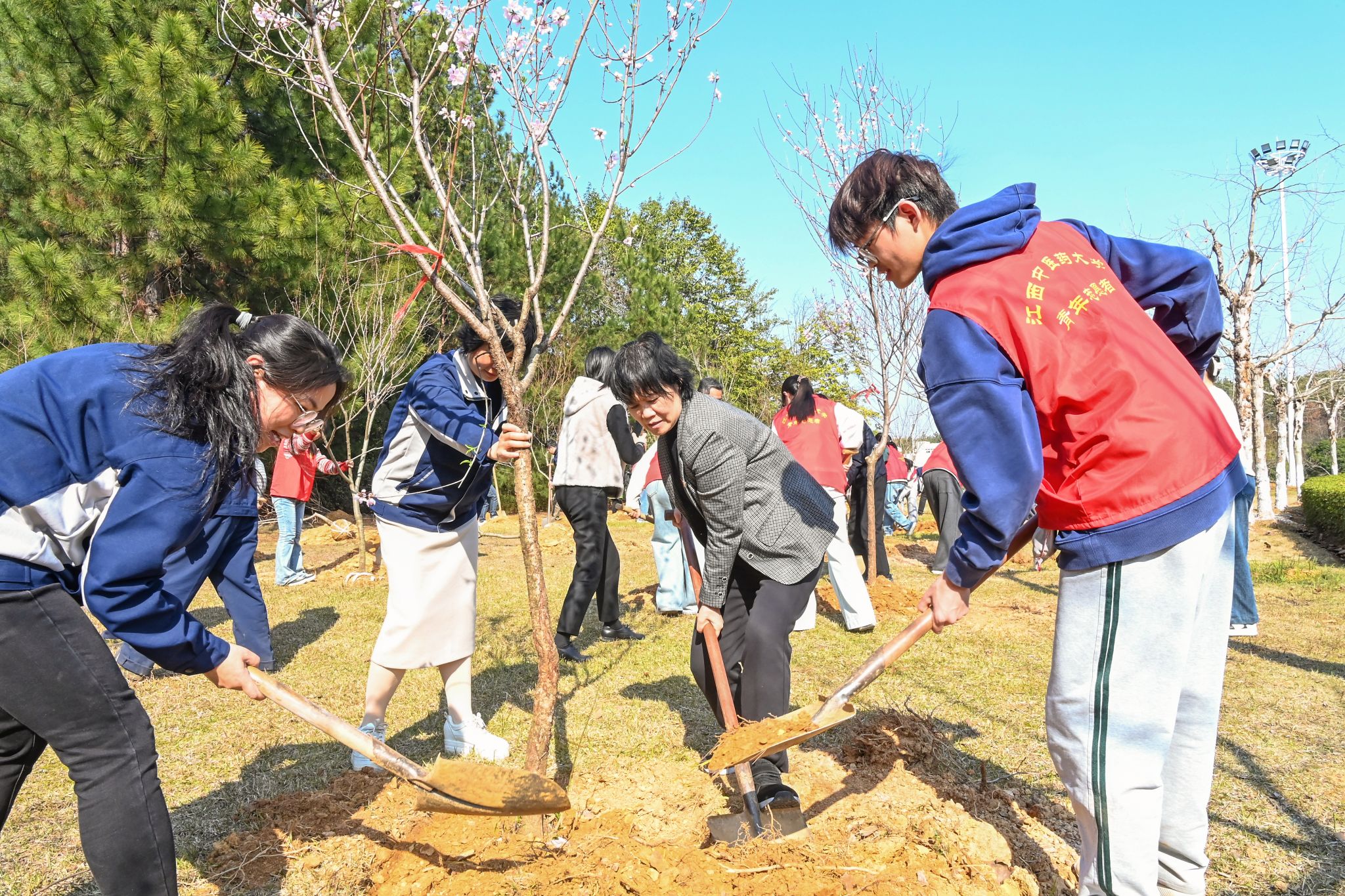 活动现场热火朝天,井然有序。校领导与师生志愿者分工协作、密切配合,从挥锹铲土、扶苗定植到培土围堰、提水浇灌,每一个环节都一丝不苟,有条不紊。大家以劳动之美践行生态理念,以实干之举筑牢绿色根基,亲手栽下的一株株桃树,不仅为校园增添了盎然生机,更象征着中医药文化薪火相传、生生不息,寓意着学校事业发展的蓬勃后劲。