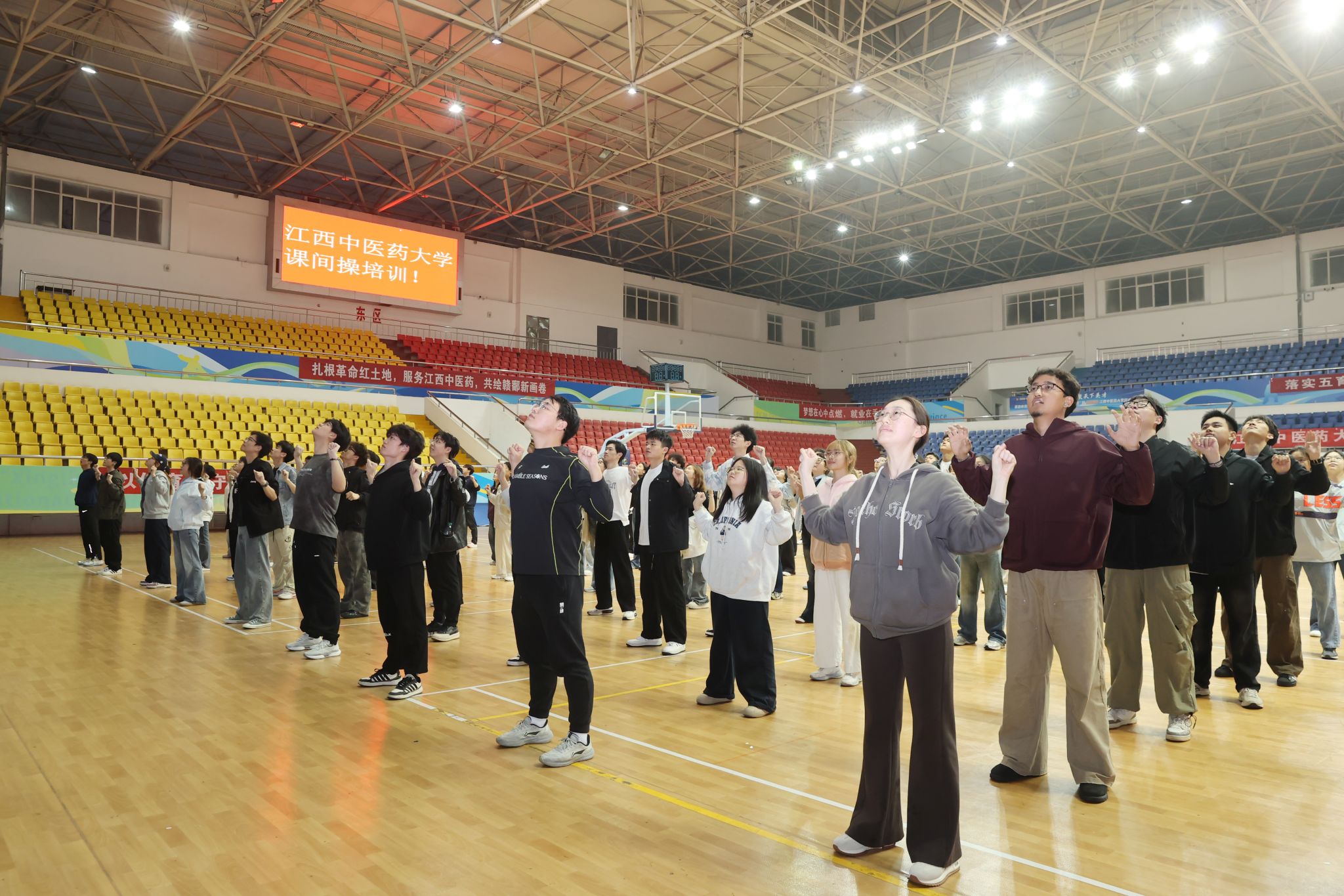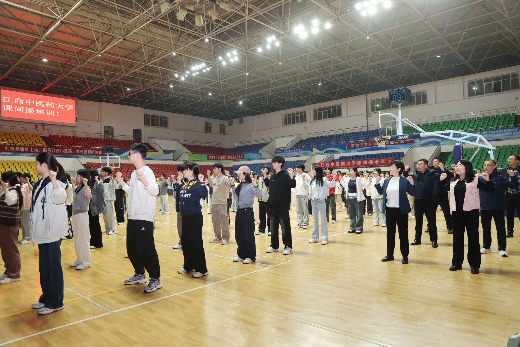 培训现场秩序井然、氛围热烈。校领导以身作则、率先垂范,认真跟随示范节奏,学习每一组动作,充分展现了对校园体育工作的高度重视与对学生身心健康的深切关怀。同学们精神饱满、热情高涨,认真领会动作要领,充分展现出江中大学子昂扬向上的青春风貌。