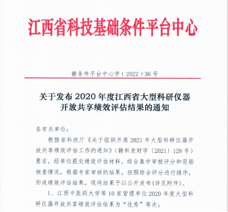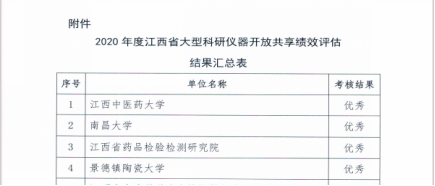 江中新闻网讯(通讯员 卢欢)近日,江西省科技厅发布了《关于发布2020年度江西省大型科研仪器开放共享绩效评估结果的通知》,我校在此次考核评估中获得“优秀”等次。本年度省内有59所高校和科研院所参评,我校考核综合评分排名第一。