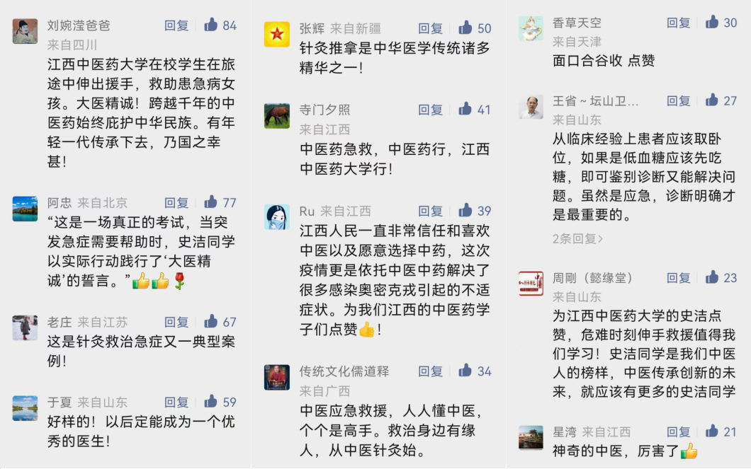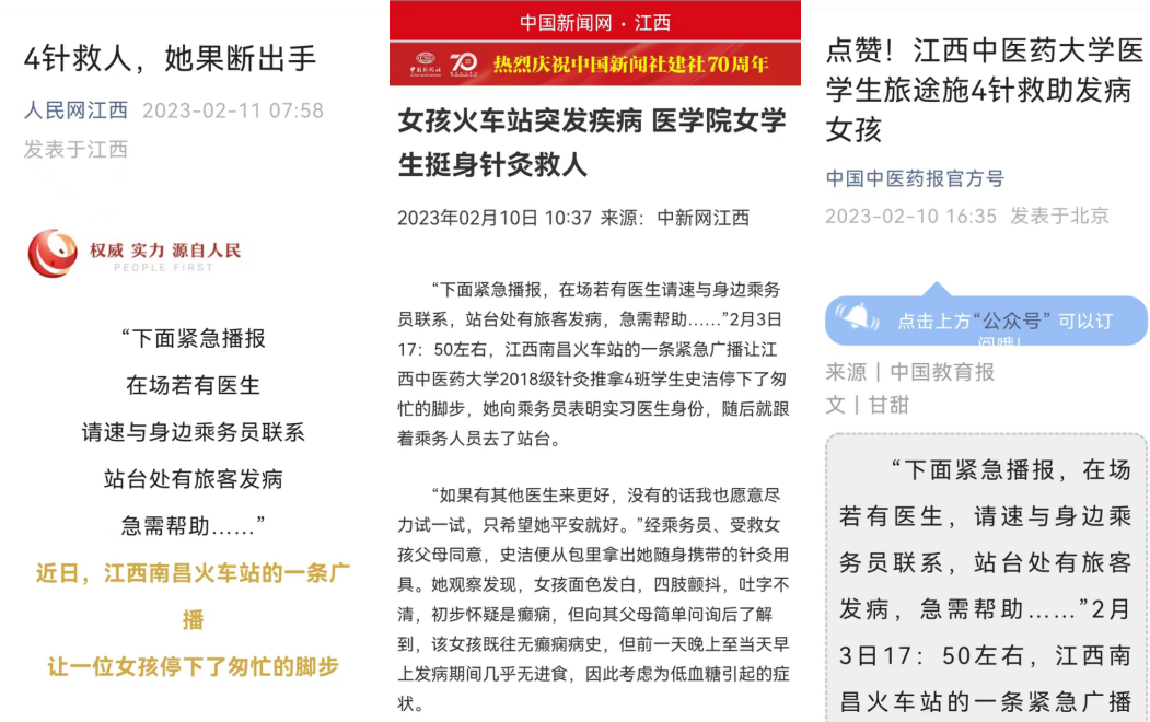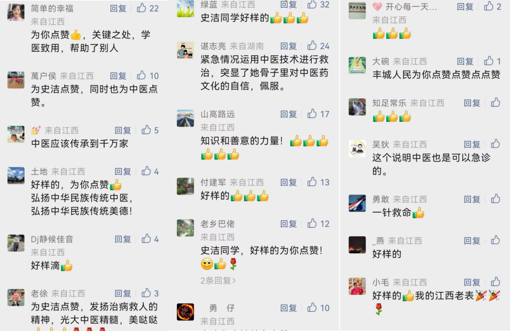 近日,中国教育报、中国中医药报、中新社、人民网、江西发布、大江网等10余家主流媒体关注报道我校2018级针灸推拿学院学生史洁在南昌火车站施针急救突发疾病女孩的感人事迹,展现了我校医学生的优良精神风貌和过硬本领,引发了社会热烈关注和广泛好评。众多网友纷纷留言,为史洁同学点赞,为中医药点赞,为江西中医药大学点赞!