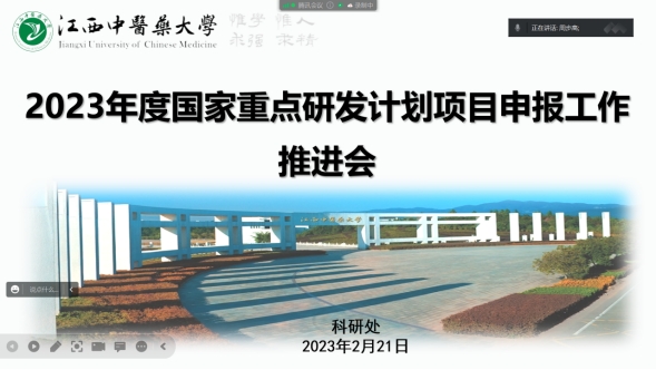 江中新闻网讯(通讯员 刘路华)2月21日,学校组织召开2023年度国家重点研发计划项目申报工作推进会,会议以线上形式举行。副校长陈焕文出席会议,会议邀请了学校岐黄学者、首席教授杨明作专家指导,各院部、科研平台及附属医院领导和科研骨干,创新团队负责人以及拟申报项目的老师等近百人参加会议。会议由科研处负责人主持。