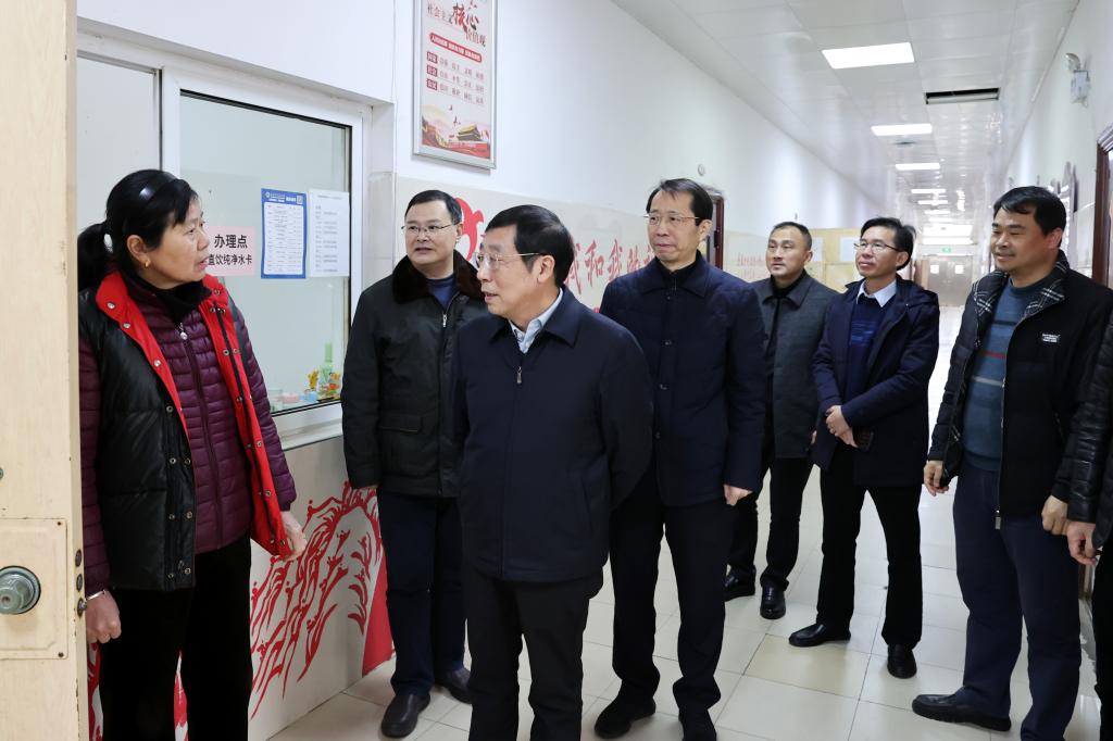 在学生宿舍,党委书记徐兰宾、党委副书记章德林与宿舍管理员交流学生住宿情况