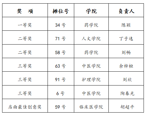 本次活动得到了全校师生的热烈响应,活动当天吸引了5000余人次参与。据统计,本次“杏林夜市”总营业额超37400元,总成交单数超6800余单。经过5个小时的营业,本次活动共评选出一等奖1项、二等奖2项、三等奖3项、店面最佳创意奖1项。获奖情况如下: