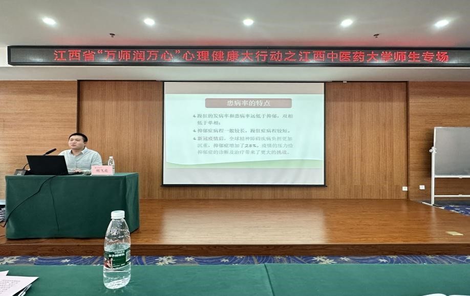 江中新闻网讯(通讯员 钟莹莹)5月9日,江西省“万师润万心”心理健康大行动之江西中医药大学师生专场在得月楼第二会议室顺利举行。本次活动由江西省教育厅社政处指导,学校心理咨询指导中心主办,校心理保健会承办,邀请到了南昌大学第二附属医院胡飞虎医生为大家授课。各学院辅导员、校心保成员及心理委员们踊跃参与。