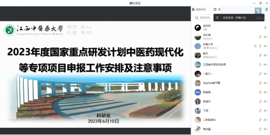 会上,科研处重大项目与平台管理办公室负责人解读了2023年度“中医药现代化”等6个重点专项申报指南,并就国家重点研发计划项目申报流程、工作安排以及申报注意事项等内容进行了详细介绍。随后,各院部、科研平台及附属医院领导和科研骨干就项目申报工作开展情况等方面进行了深入交流。
