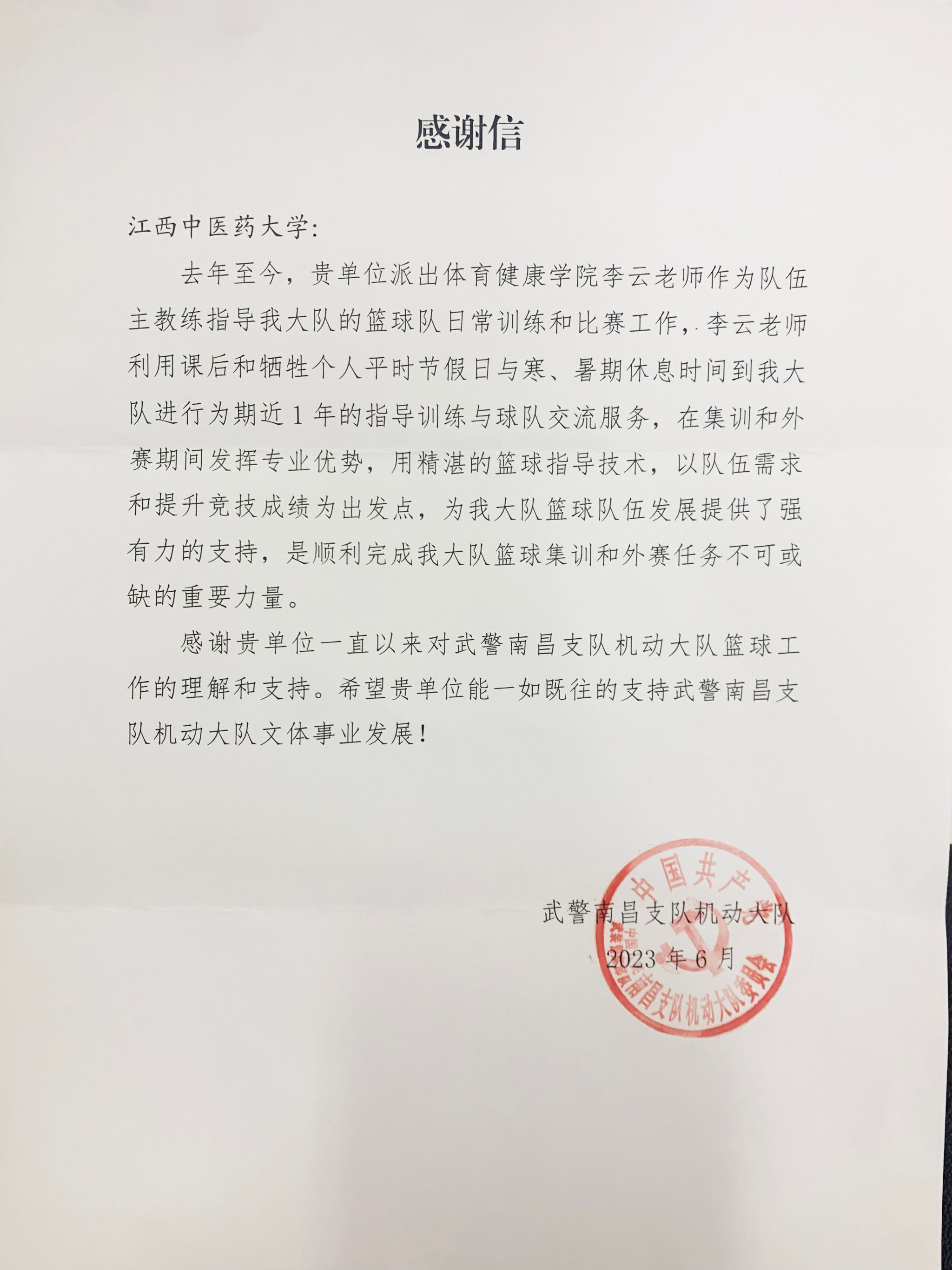江中新闻网讯(通讯员 李云 吴欢乐)6月30日,武警南昌支队机动大队中校政治教导员范会凯代表武警南昌支队机动大队(以下简称机动大队)党委向我校送来感谢信并为相关指导老师送上锦旗,对我校一直以来对武警南昌支队机动大队文体工作支持表示感谢,并给予高度评价。