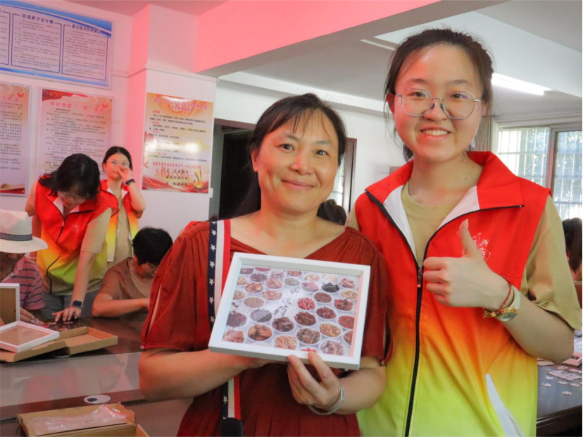 在封溪社区,“悬壶”青年服务队与当地居民进行中医药拼图与香囊制作。服务队队员们与当地居民们相互配合协作,齐心协力对照成品图将拼图拼好,用寓教于乐的方式让居民了解中医药,亲近中医药。当地居民们在听了服务队员对中药香囊的讲解后产生了浓厚兴趣,积极参与到制作过程中来,活动现场弥漫着一股淡淡的中草芳香。在制作完成后,当地居民与队员们一起合影,露出了满足的笑容。
