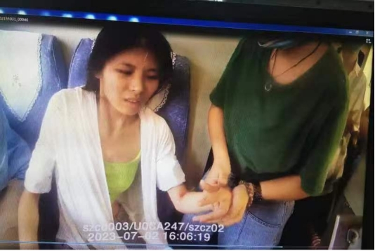 当下,黄晓霞立即取出针灸针,迅速下针印堂穴、百会穴、人中穴,下完针后观察到乘客眼睛慢慢睁开。见有好转,黄晓霞迅速行针,并在该乘客的肘窝进行揪痧,很快出了痧,乘客意识慢慢苏醒,嘴唇逐渐红润,脸色也慢慢变红,黄晓霞心里松了一口气。稍后,列车长还取了藿香正气水帮助乘客服下。