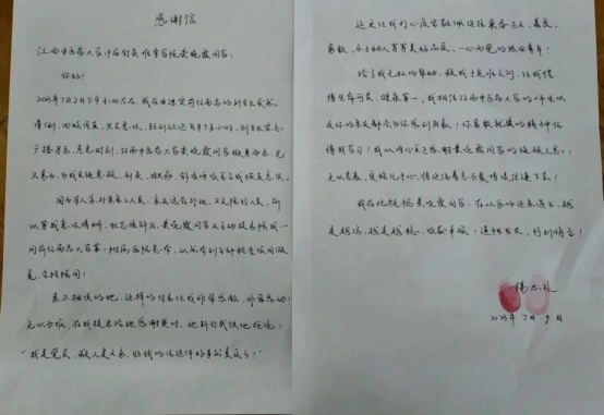 到了南昌后,黄晓霞还全程陪同该乘客到医院就诊。7月9日,该乘客给黄晓霞发来了感谢信,字里行间充满着内心的感激和感动。