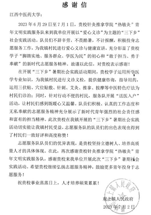 江中新闻网讯 近日,学校收到来自樟树市观上镇的感谢信,感谢我校针灸推拿学院“热敏灸”青年文明实践服务队开展以“爱心义诊”为主题的“三下乡”社会实践活动,表扬了我校学子“脚踏实地、服务群众、学医为民”的初心和“敢于担当、勇于奉献”的新时代志愿服务精神。