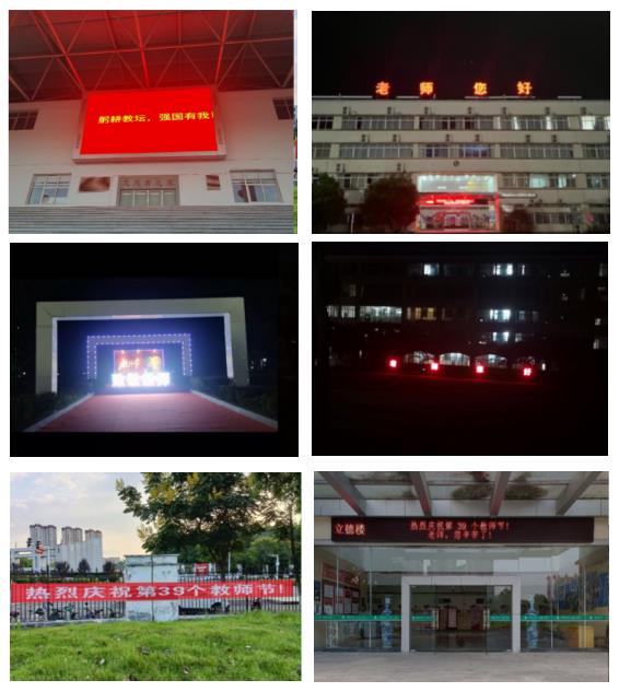 学校通过举办“为教师亮灯”公益活动,还利用各类宣传阵地播放宣传“热烈庆祝第39个教师节,向老师致敬!”“躬耕教坛,强国有我”等标语,向广大教师表达节日祝福,激发广大教师热爱教育、关心学生的高尚情怀,提升爱岗敬业、教书育人的积极性,积极营造尊师重教的良好环境和浓厚氛围。