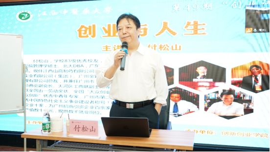 江中新闻网讯(通讯员 周莉 黄小丽)10月29日下午,学校第49期“创业讲堂”在大学生创新创业园路演大厅进行。本期讲堂特邀我校83级知名校友,江西山高制药有限公司、广东履安实业有限公司(集团)总裁付松山作为嘉宾,以《创业与人生》为题进行专题报告,学校400余名师生聆听了报告。