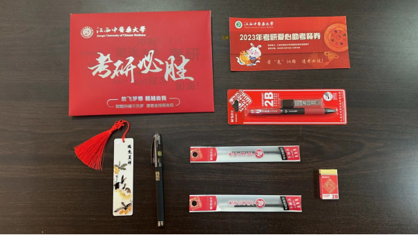据悉,学校为每一位2024届考研学生发放考研暖心“加油包”,送上“考研必胜”暖心祝福。“加油包”里有答题专用文具套装、江中医定制“瑞兔呈祥”书签和考研爱心助考餐券等。