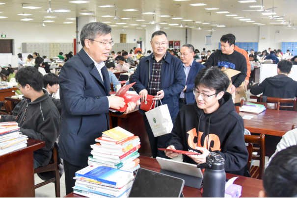 “同学们辛苦了!要保持良好心态,坚定必胜信念,祝你们研考旗开得胜!”11月23日,副校长周志刚在学工处、后勤保障服务中心负责人的陪同下,来到图书馆考研自习室看望慰问考研学子,与同学们亲切交谈,表达学校的祝福和关心。