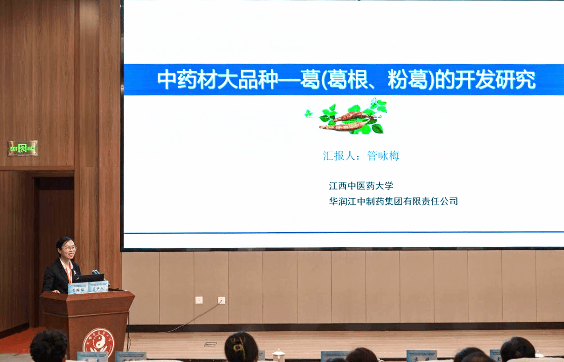 现代中药制剂教育部重点实验室管咏梅教授以《中药材大品种葛(葛根、粉葛)的开发研究》为题作了大会报告,她围绕葛(葛根、粉葛)的“种-采-制-用”全产业链,以葛的物质基础及核心功效生物学机制研究为基础和突破点, 介绍了葛根、粉葛的基原、种植技术、药之链、食之链、综合链的“一核二源三链四环”的研究模式。