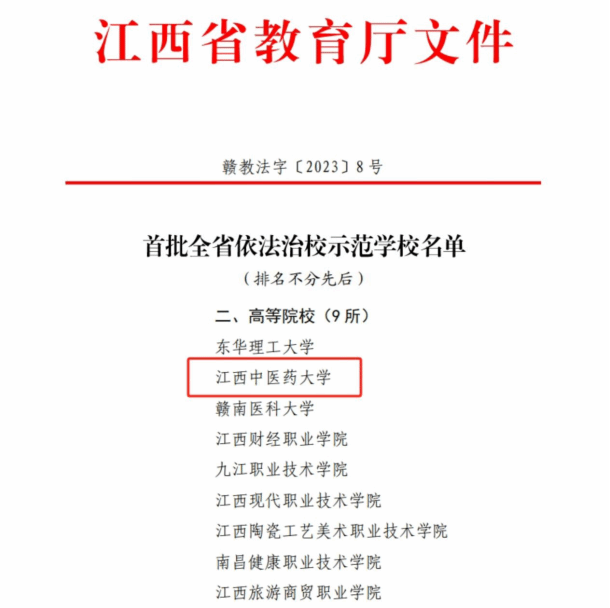 江中新闻网讯(记者 熊灵)近日,省教育厅印发《关于认定首批全省依法治校示范学校的通知》(赣教法字〔2023〕8 号),全省共有9所高校入选“首批全省依法治校示范学校”,我校名列其中。