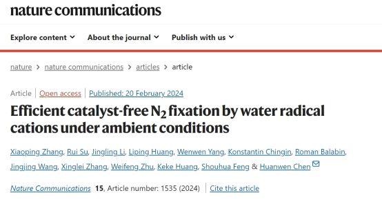 江中新闻网讯(通讯员 黄丽萍 刘路华)在江西中医药大学副校长陈焕文教授的带领下,由东华理工大学、江西中医药大学和吉林大学组成的研究团队在水自由基阳离子固氮实现氨的绿色合成方面取得了重要进展。相关研究成果《环境条件下水自由基阳离子歧化固氮》(Efficient catalyst-free N2 fixation by water radical cations under ambient conditions),于《自然》(Nature)杂志旗下期刊《自然通讯》(Nature Communications)在线发表。