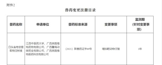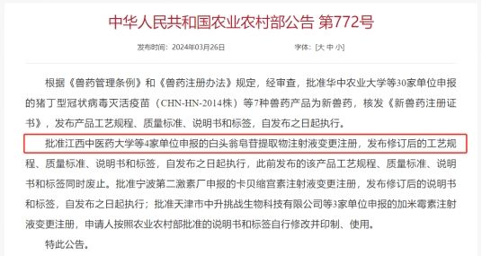 江中新闻网讯(通讯员 王琦)3月26日,农业农村部发布公告,批准江西中医药大学研发的白头翁皂苷提取物注射液增加靶动物仔猪,用于治疗仔猪腹泻。白头翁皂苷提取物和白头翁皂苷提取物注射液于2021年获批国家二类新兽药,用于治疗奶牛乳房炎。此次增加靶动物及适应症,进一步拓展该药物的临床价值。