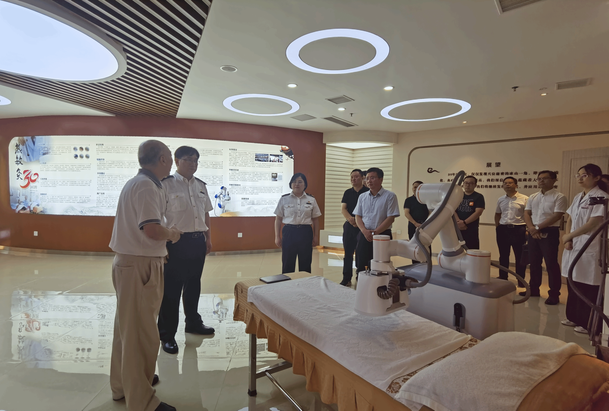 会后,胡美良一行来到热敏灸机器人展示现场,认真听取了产品的创新性和可用性,纷纷表示对热敏灸技术有了更深认识,表示今后将进一步加大与我校对接交流力度,支持热敏灸技术创新发展,为学校高质量发展助力赋能。