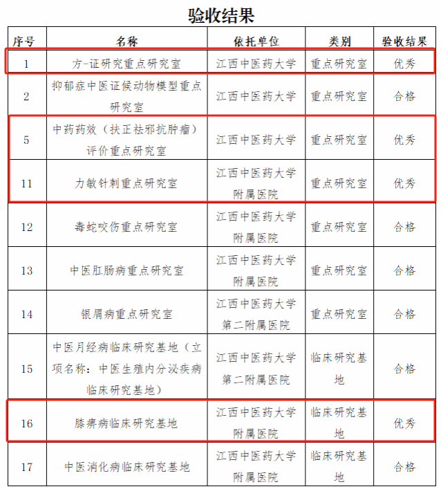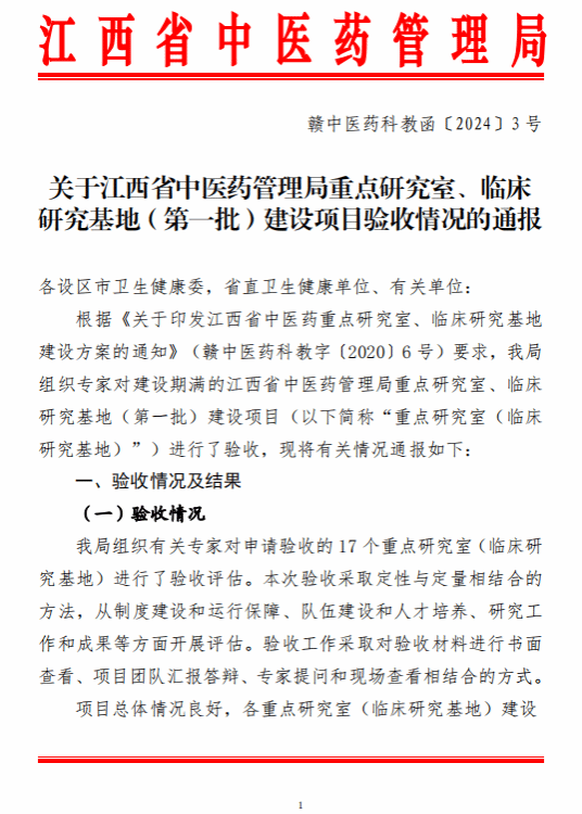 江中新闻网讯(通讯员 刘路华)近日,江西省中医药管理局公布了首批局重点研究室、临床研究基地建设项目验收情况,我校及附属医院牵头组建的10个平台顺利通过验收。其中,左铮云教授领衔的“方-证研究重点研究室”、陈兰英教授领衔的“中药药效(扶正祛邪抗肿瘤)评价重点研究室”、付勇教授领衔的“力敏针刺重点研究室”和杨凤云教授领衔的“膝痹病临床研究基地”等4个平台获评优秀。