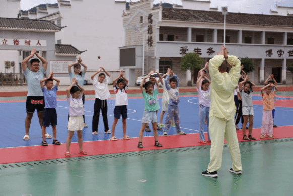 “对,很棒!手再伸直一些,膝盖向前弯曲,保持弓步站稳。”流坑古村的小朋友认真跟练,眼神坚毅,一丝不苟。家长看后不由感慨:“平时小孩在家里总是玩手机,不爱运动,没想到今天练功练得这么认真,我们老祖宗传下来的真是好东西啊!”