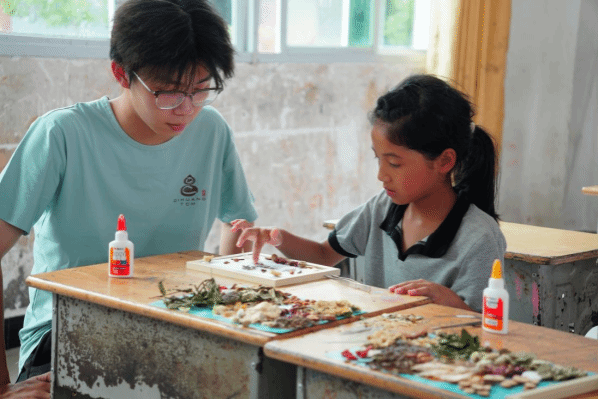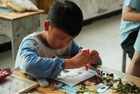 “姐姐,这个是什么药呀,它的味道好奇怪啊!”“这个一圈一圈的药又叫什么呀”。“这个叫鸡血藤,你看他长的像不像树木的年轮一样”。在志愿者们的耐心指导下,孩子们用中药材作为画笔,完成了自己的贴画作品。
