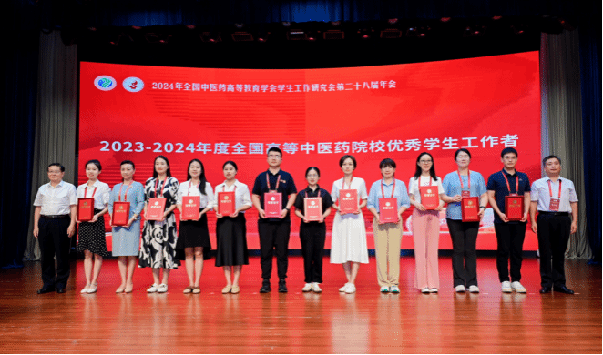 大会表彰了2023-2024年度全国高等中医药院校优秀学生工作者、优秀辅导员。我校金正吉、丁之旺、徐玺、黄俊麟等4名同志荣获“全国高等中医药院校优秀学生工作者”荣誉称号;余浩、李欢、张寒英、葛洪君等4名同志荣获“全国高等中医药院校优秀辅导员”荣誉称号。