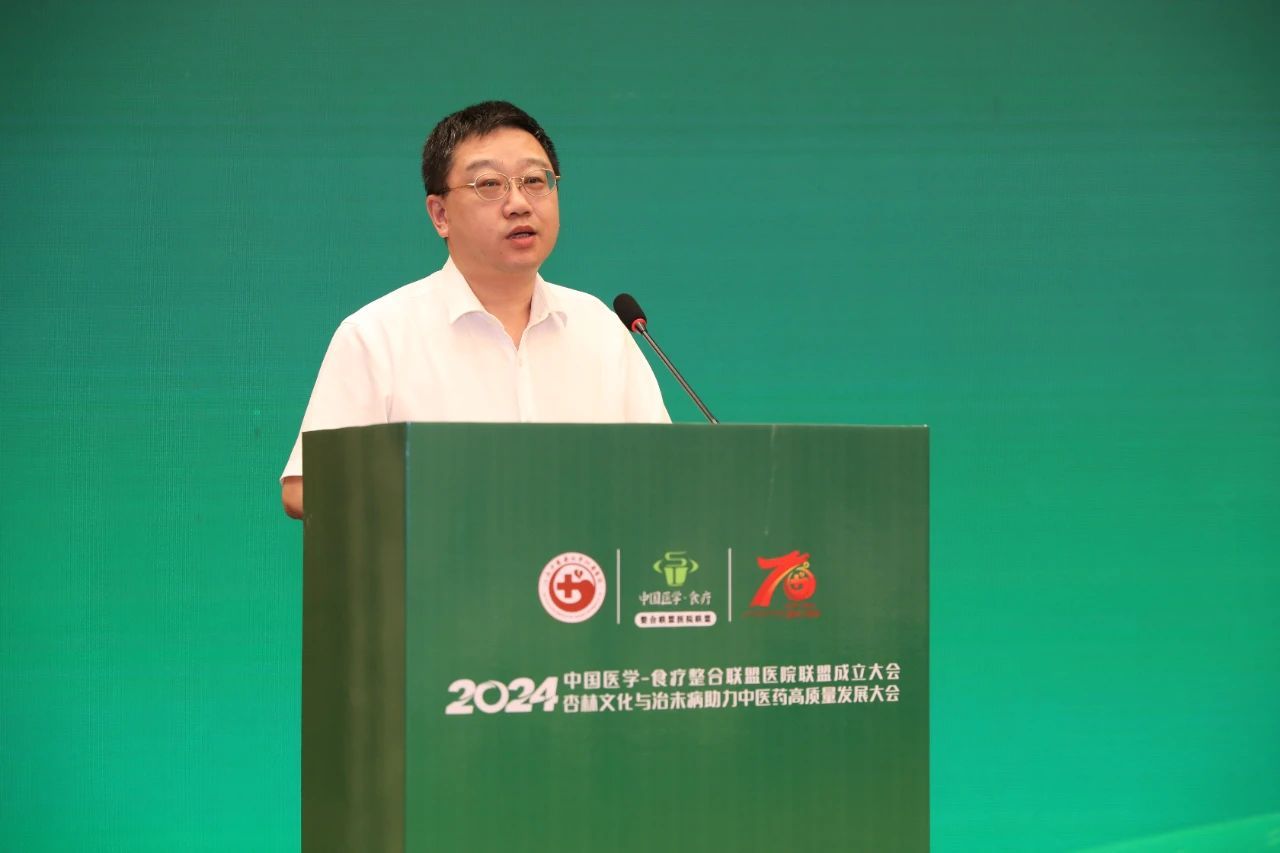 江西中医药大学党委副书记、校长、中国医学—食疗整合联盟常务副理事长朱卫丰宣读联盟关于同意成立中国医学-食疗整合联盟医院联盟及其组织架构的批复