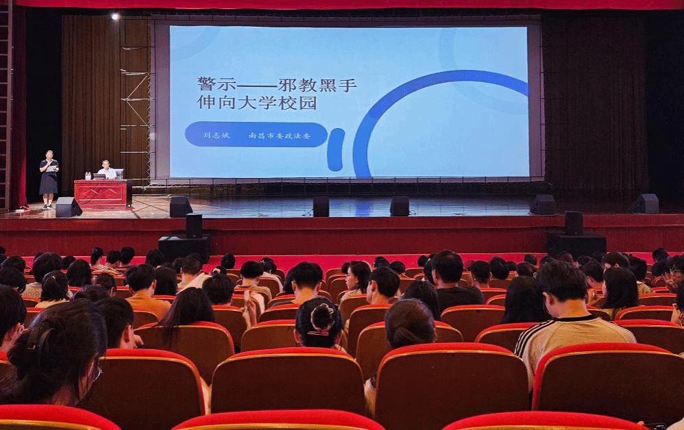 江中新闻网讯(通讯员 高贵森)为进一步深化反邪教工作,切实提高我校师生的识邪、辨邪、防邪、拒邪的意识和能力,9月13日下午,学校平安办邀请了南昌市委政法委政治部主任刘志斌在神曲厅开展反邪教教育宣讲活动,学校党委委员、副校长周志刚,党委委员、统战部部长薛铁瑛以及保卫处、学工处相关负责人和全体辅导员、700余名学生参与了此次宣讲活动。