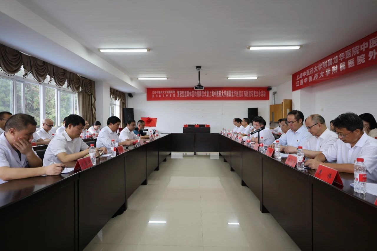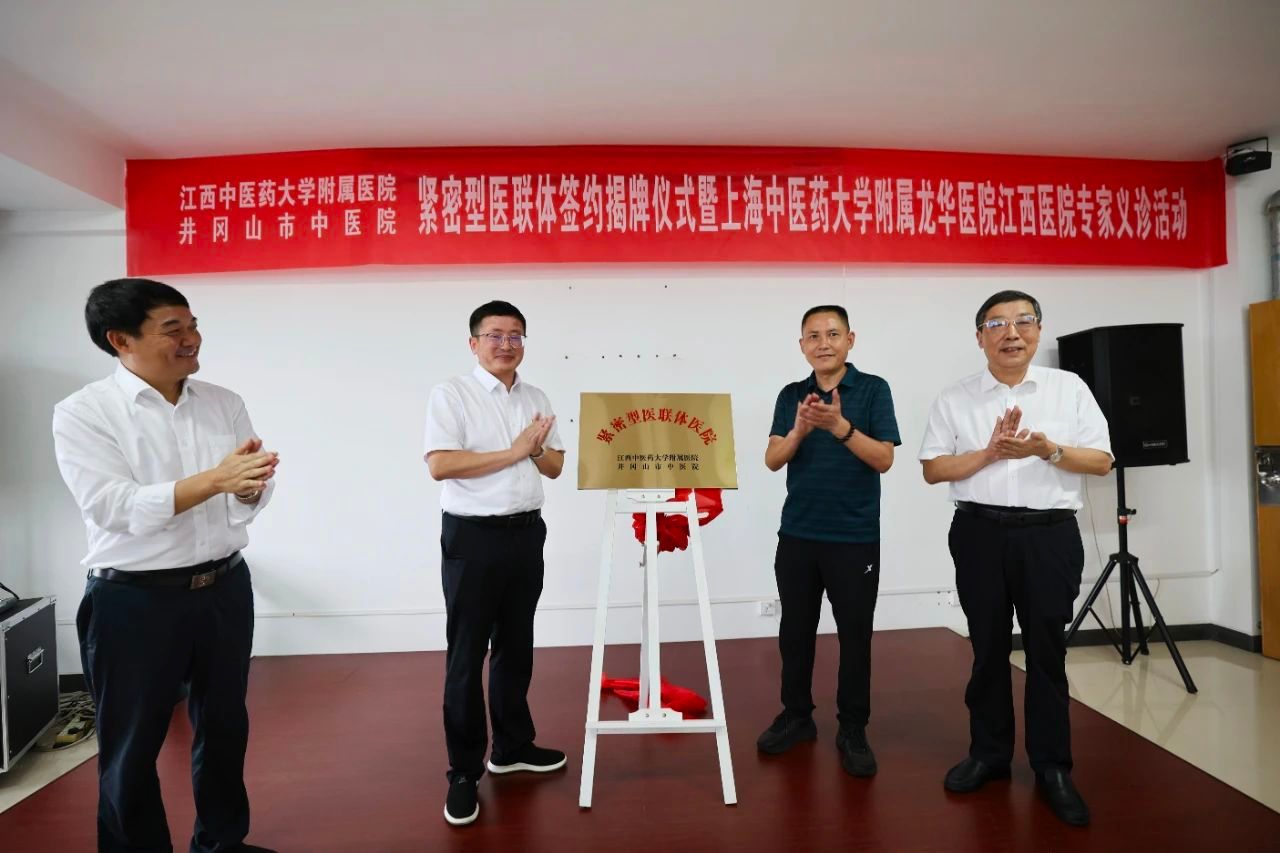 江中新闻网讯 9月20日,江西中医药大学附属医院与井冈山市中医院紧密型医联体签约揭牌仪式在井冈山举行。江西中医药大学党委书记徐兰宾;上海中医药大学附属龙华医院党委副书记、院长,上海龙华江西医院总院长陈跃来;江西中医药大学党委委员、副校长、附属医院党委书记,上海中医药大学附属龙华医院江西医院党委书记严小军;吉安市副市长、井冈山管理局党工委书记、井冈山市委书记廖东生;江西中医药大学附属医院党委副书记、院长刘良徛;上海中医药大学附属龙华医院副院长,上海龙华江西医院副院长李屹等出席签约揭牌仪式,井冈山市副市长邓志贤主持仪式。附属医院相关领导,上海中医药大学附属龙华医院和江西中医药大学附属医院义诊专家,井冈山市卫健委相关领导,井冈山市中医院党委书记段峻青,院长龙盛华和职工代表参加。
