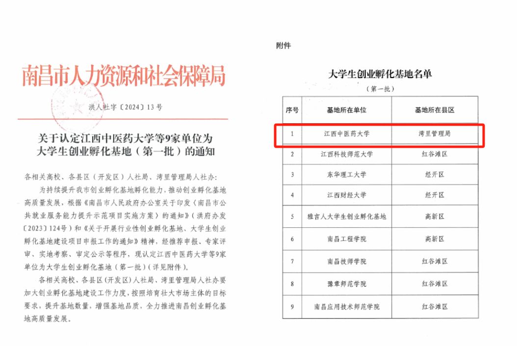 江中新闻网讯(通讯员 周莉)近日,南昌市人力资源和社会保障局下发通知,我校获批为南昌市首批大学生创业孵化基地。