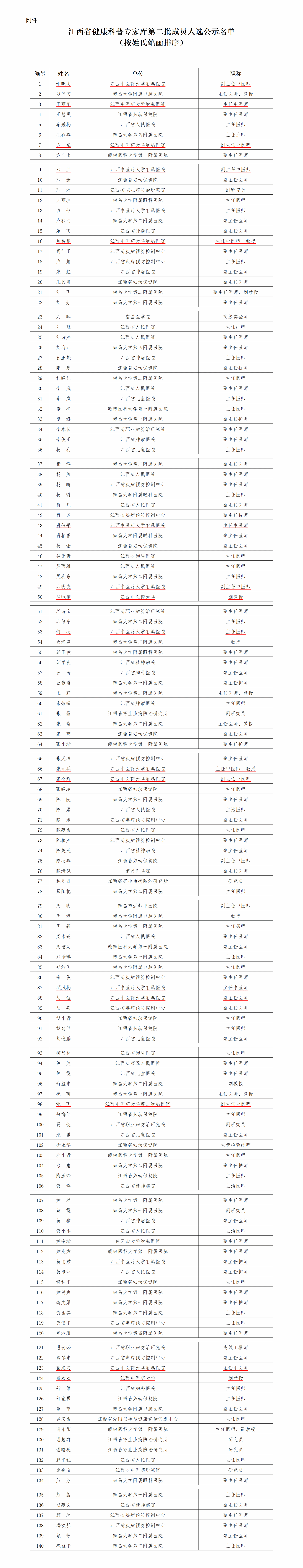江中新闻网讯(通讯员 张雷)近期,江西省卫生健康委员会公布了江西省健康科普专家库第二批成员名单,经前期精心组织申报,我校于晓明、王丽华等18名专家成功入选,名单如下: