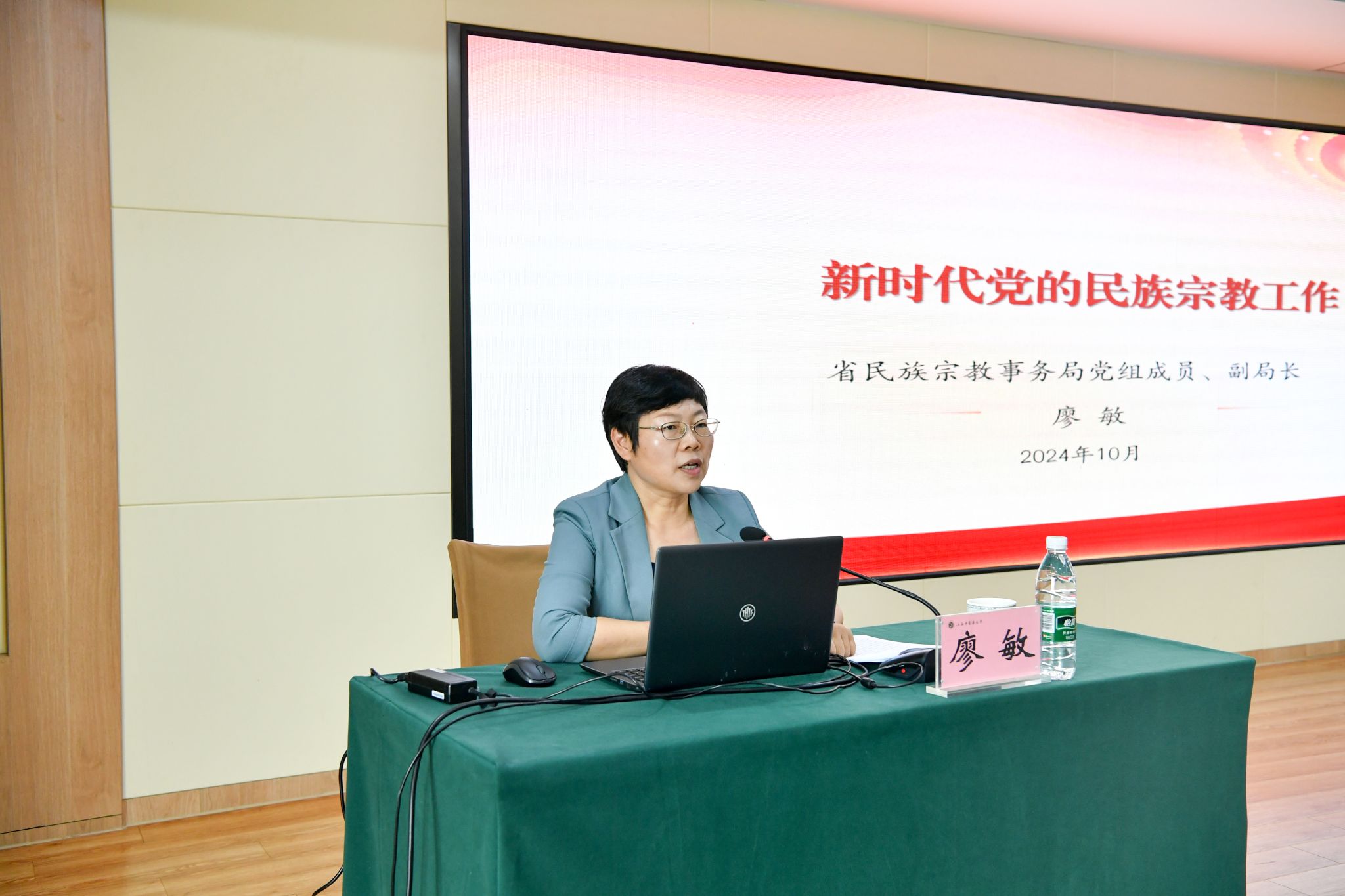 廖敏作了题为“新时代党的民族宗教工作”专题辅导报告,她从“习近平总书记关于加强和改进民族工作的重要思想、关于宗教工作的重要论述的主要内涵;以铸牢中华民族共同体意识为主线,着力推进新时代党的民族工作高质量发展;坚持我国宗教中国化方向,认真做好新时代党的宗教工作”等三个方面进行阐述,全面分析了我省当前民族宗教工作面临的形势任务,深刻解读了马克思主义宗教观、党的民族宗教方针政策和国家相关法律法规。