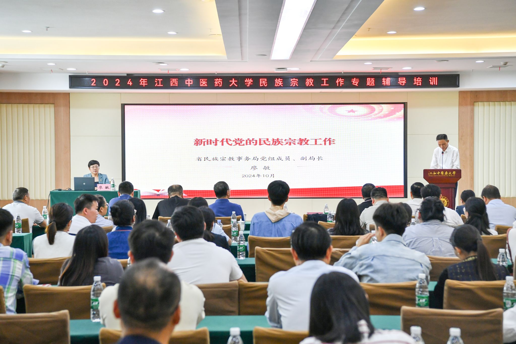 江中新闻网讯(通讯员 王诗宜)10月18日下午,我校举办2024年民族宗教工作专题辅导培训,省民族宗教事务局党组成员、副局长廖敏应邀作专题辅导,学校党委委员、副校长朱根华主持。学校党委委员、统战部部长薛铁瑛,各有关职能部门负责人、各学院党委(党总支)书记以及分管学生工作副书记、全体辅导员、各部门统战工作联络员、思想政治理论课专兼职教师等100余人参加培训。