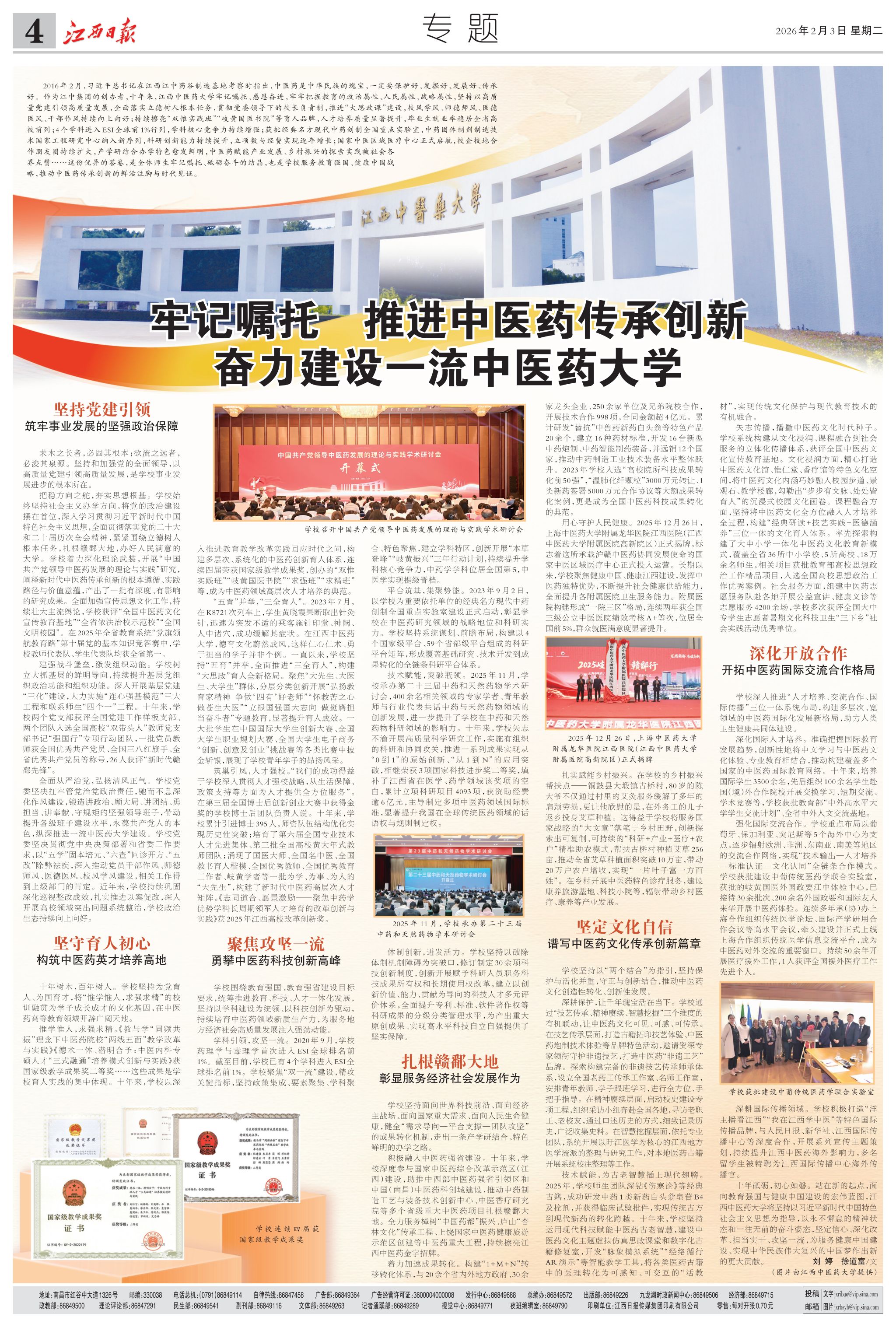 2016年2月,习近平总书记在江西江中药谷制造基地考察时指出,中医药是中华民族的瑰宝,一定要保护好、发掘好、发展好、传承好。作为江中集团的创办者,十年来,江西中医药大学牢记嘱托、感恩奋进,牢牢把握教育的政治属性、人民属性、战略属性,坚持以高质量党建引领高质量发展,全面落实立德树人根本任务,贯彻党委领导下的校长负责制,推进“大思政课”建设,校风学风、师德师风、医德医风、干部作风持续向上向好;持续擦亮“双惟实践班”“岐黄国医书院”等育人品牌,人才培养质量显著提升,毕业生就业率稳居全省高校前列;4个学科进入ESI全球前1%行列,学科核心竞争力持续增强;获批经典名方现代中药创制全国重点实验室,中药固体制剂制造技术国家工程研究中心纳入新序列,科研创新能力持续提升,立项数与经费实现逐年增长;国家中医区域医疗中心正式启航,校企校地合作朋友圈持续扩大,产学研结合办学特色愈发鲜明,中医药赋能产业发展、乡村振兴的探索实践被社会各界点赞……这份优异的答卷,是全体师生牢记嘱托、砥砺奋斗的结晶,也是学校服务教育强国、健康中国战略,推动中医药传承创新的鲜活注脚与时代见证。