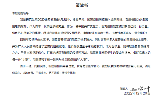 “作为医学研究生,作为一名中国共产党员,面对疫情应该贡献自己的力量,做力所能及的事情。我申请奋战在临床一线,坚守岗位!”