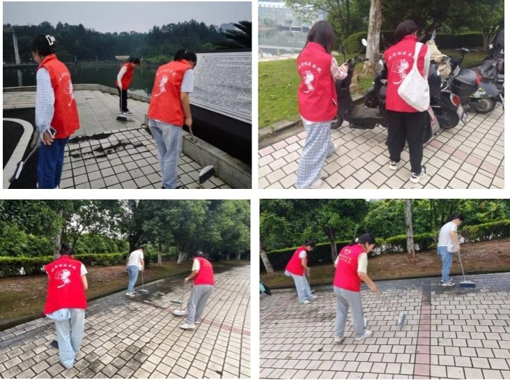 在劳动过程中,志愿者们团结协作、分工明确,每个人都认真进行劳动,手持清洁工具,对草坪、道路等区域的垃圾进行了细致清理,同时还对学校镜湖周边的电动车进行了统一归置,保障了车辆停放的整齐有序以及道路的畅通无阻。劳动时的汗水遮不住他们的蓬勃朝气,身上的红色志愿马甲更显青春活力。