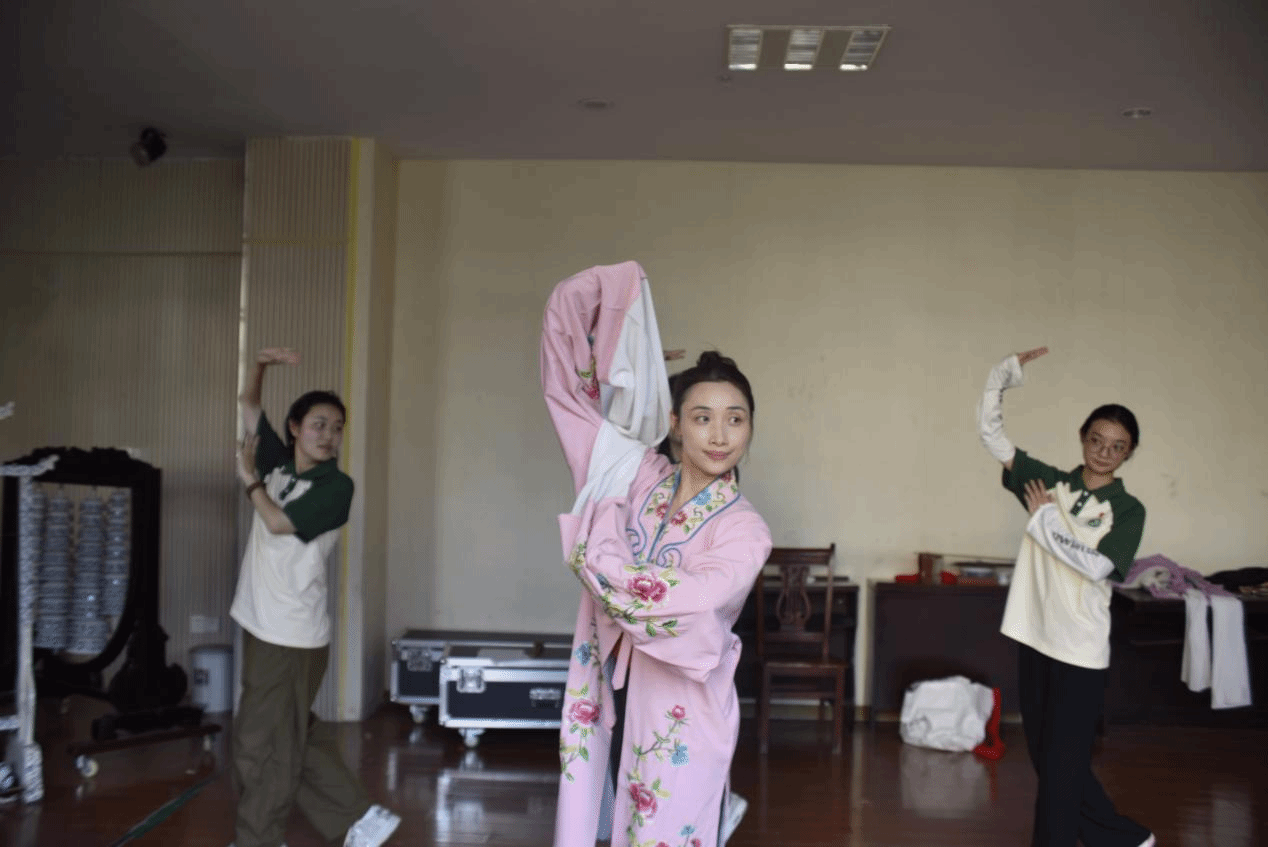 “抖,掷,挥,翻,扬,甩……”水袖灵动飘逸,似袅袅升腾的云雾,似涌动的波涛,伴随着演员的舞姿,在空中流淌翻腾。实践队员身着练功服,在赣剧团演员手把手的指导下,学习扬袖和基础的赣剧表演动作。队员们跟随老师的动作,双手似拈花,从眉梢间拂过,眼神缓缓抬起,眼波流转,少女欲说还休的形象跃然眼前。