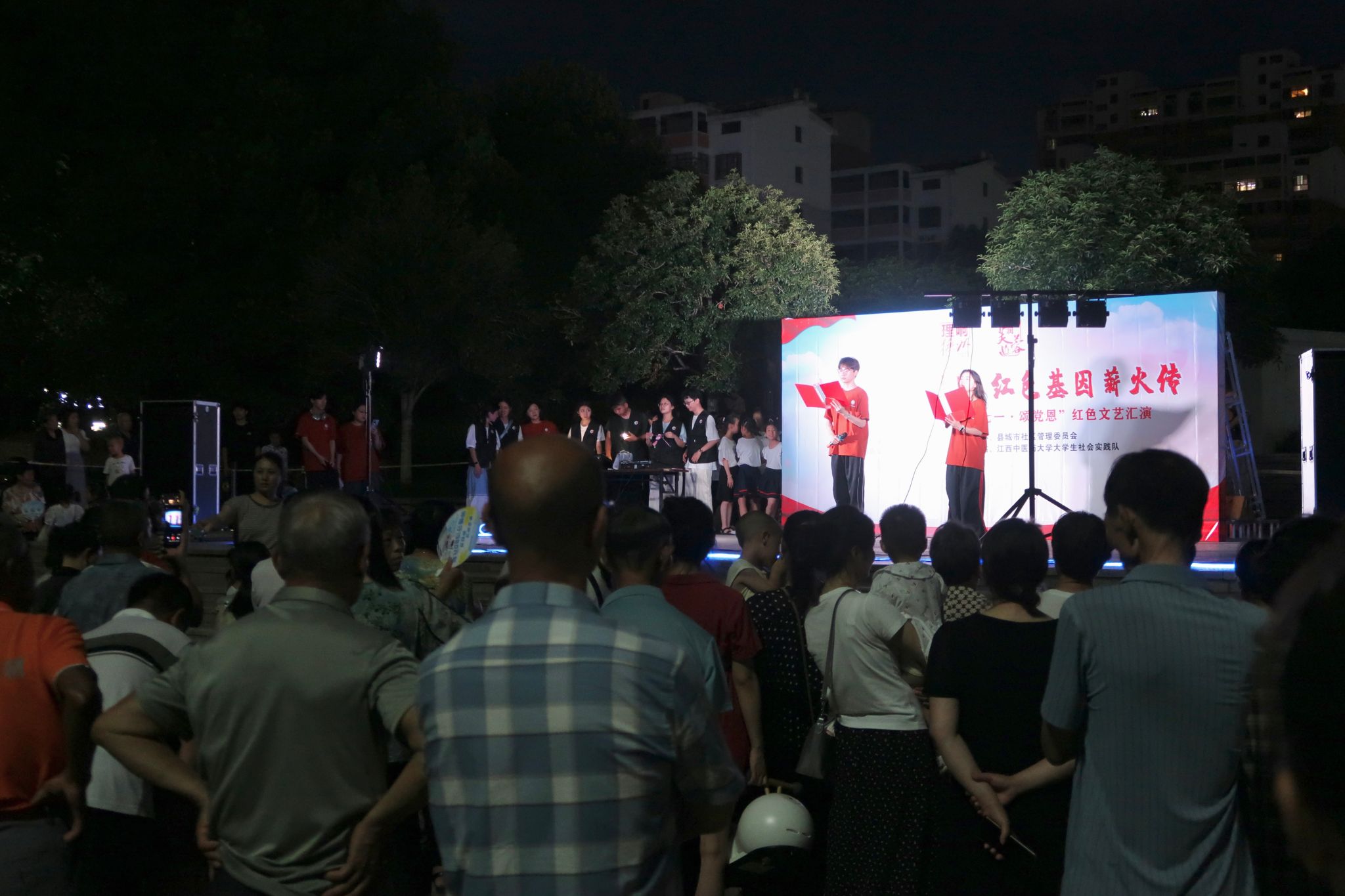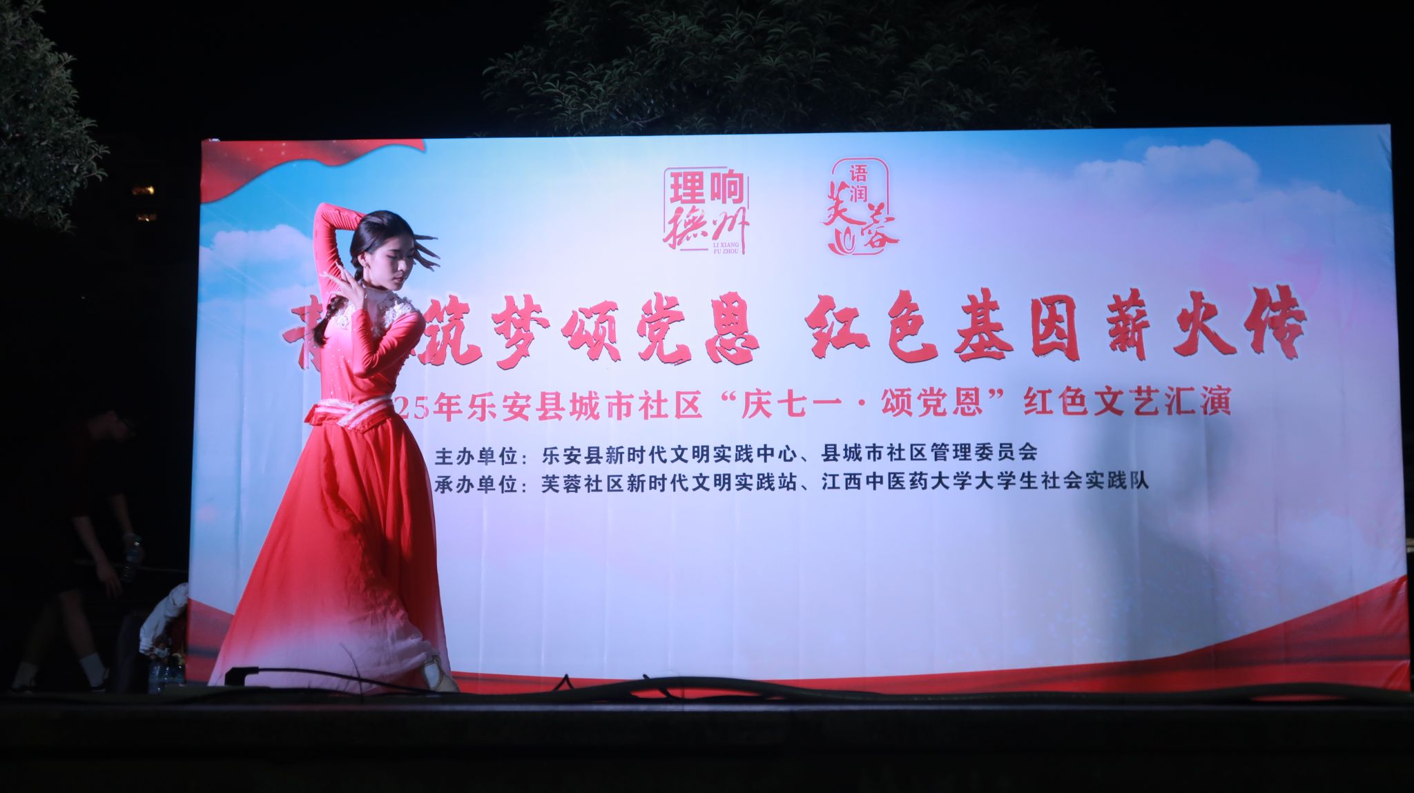 江中新闻网讯 6月29日晚,江西中医药大学大学生艺术团社会实践队、麦芽堂社会实践队来到乐安县城区芙蓉社区新时代文明实践站,联合芙蓉社区管委会在乐安县四九广场开展青春筑梦颂党恩、红色基因薪火传——“庆七一 颂党恩”红色文艺汇演,以文艺表演的形式礼赞党的光辉历程,吸引数百名居民围观。