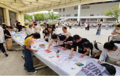 江中新闻网讯 9月30日,学工处举办“笔墨承古韵,丹青贺国庆”主题彩绘活动,邀请全校师生共绘祖国大好河山,用创意与热情为国庆添彩。活动前期,一站式服务中心的志愿者提前筹备,将两张巨幅空白画布平铺于活动现场,周边整齐摆放水彩笔、水粉、调色盘等绘画工具,柔和的灯光与鲜艳的颜料相映,提前营造出喜庆温馨的氛围。