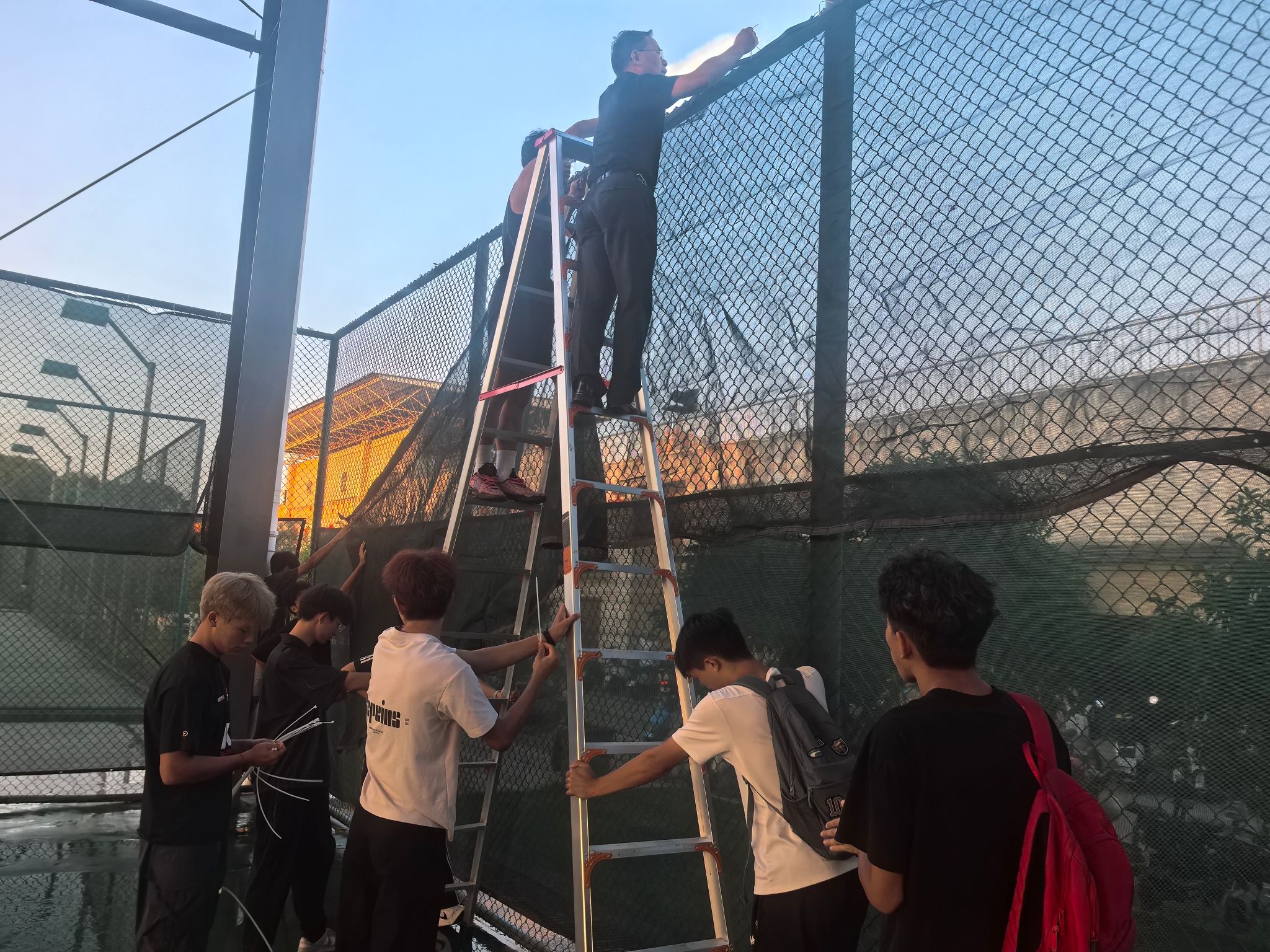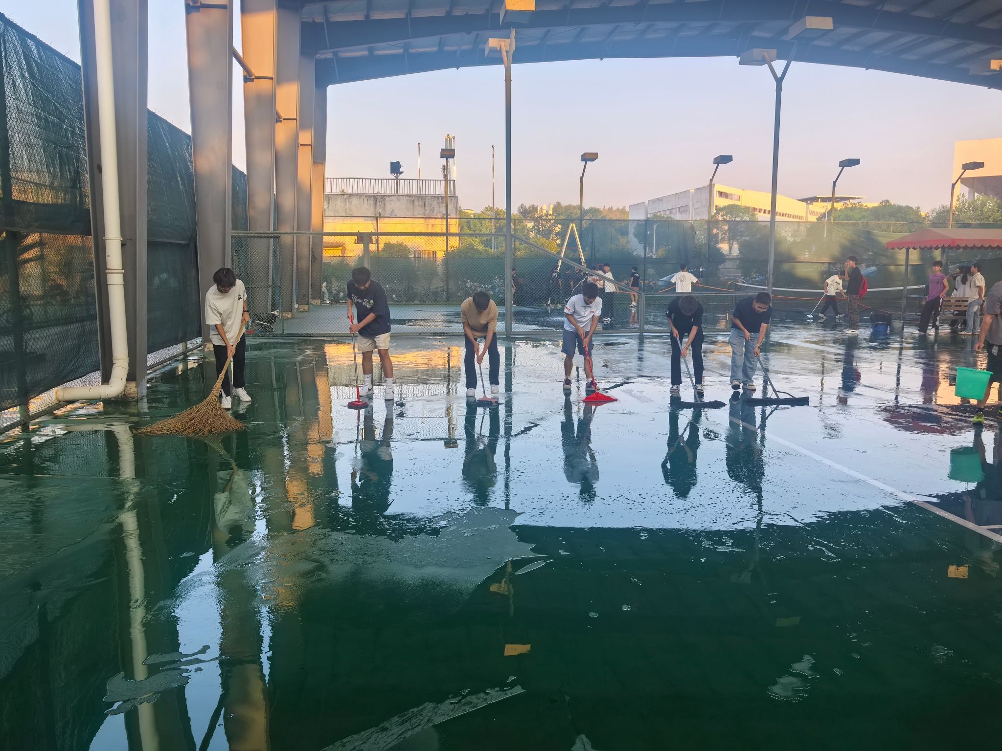 活动现场,学院领导与同学们一同拿起扫帚、拖把等工具,分工协作清理场地,大家不怕脏、不嫌累,对网球场进行了深度清理。同学们热情高涨,相互配合,原本布满灰尘和散落杂物的网球场很快变得整洁有序。