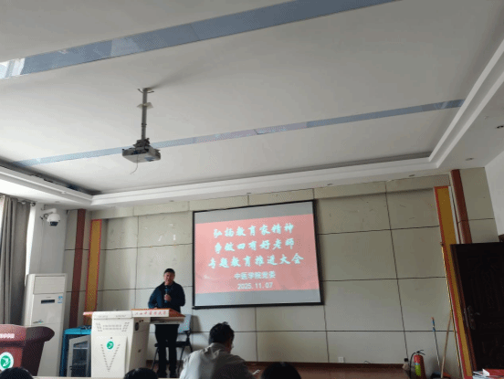 江中新闻网讯 (通讯员 孙法莹)为深入贯彻立德树人根本任务,推动教育家精神与学院教育实践深度融合,11月7日下午,中医学院召开“弘扬教育家精神争做四有好老师”专题教育推进会。会议由学院党委书记主持,全体教职工参会。