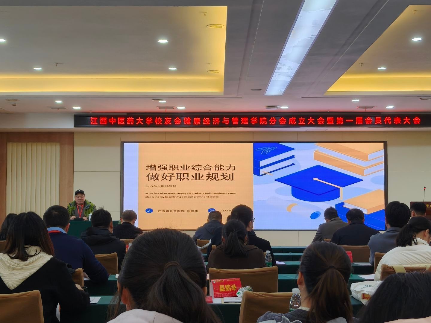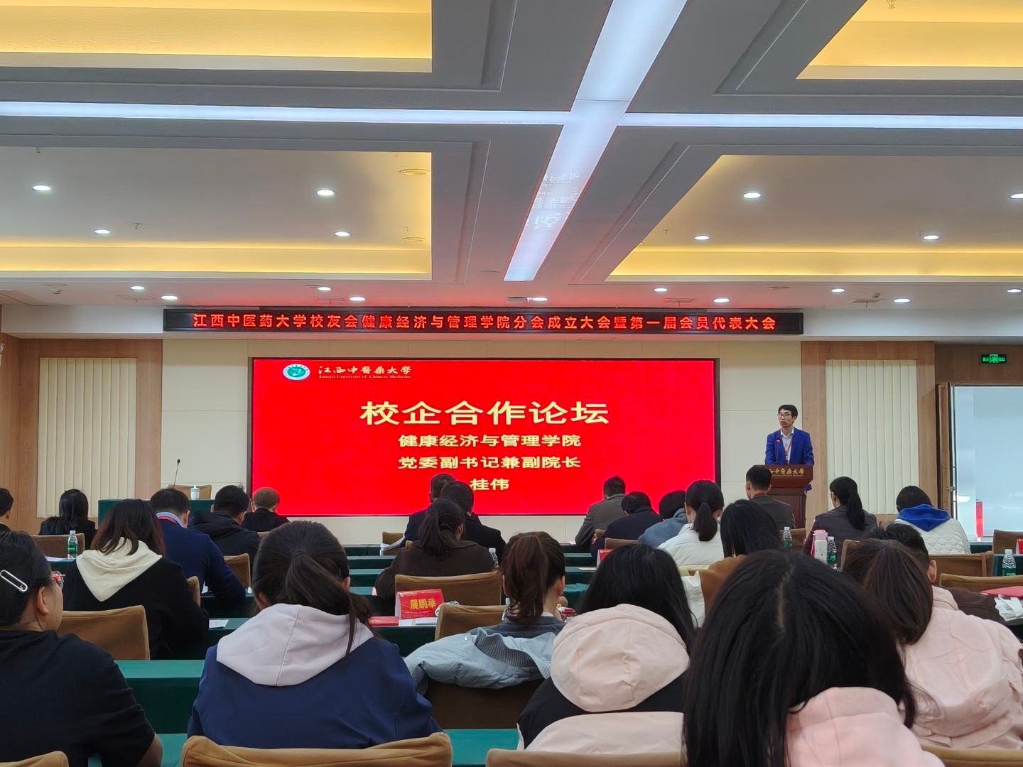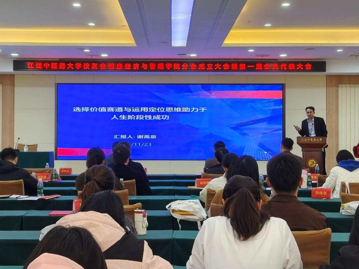 随后,2006届中医学(医事法律方向)校友、江西众益医购链管理有限责任公司董事长谢高泉以《选择价值赛道与运用定位思维助力于人生阶段性成功》为题分享。他指出:赛道选择大于努力,需结合时代趋势与自身优势,比如通过银发经济、生物医药视角+技能兴趣锁定价值赛道;运用定位思维明确“我是谁、能提供什么独特价值”,在同质化竞争中精准卡位。他以自身创业经历为例,鼓励学生聚焦健康产业细分领域,通过跨界整合实现突破。
